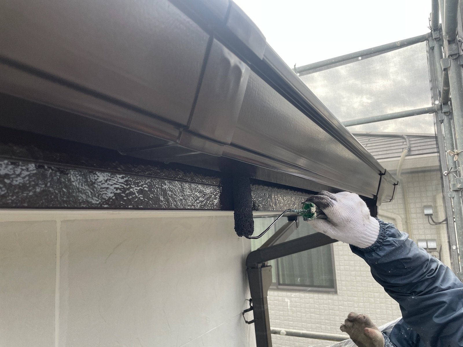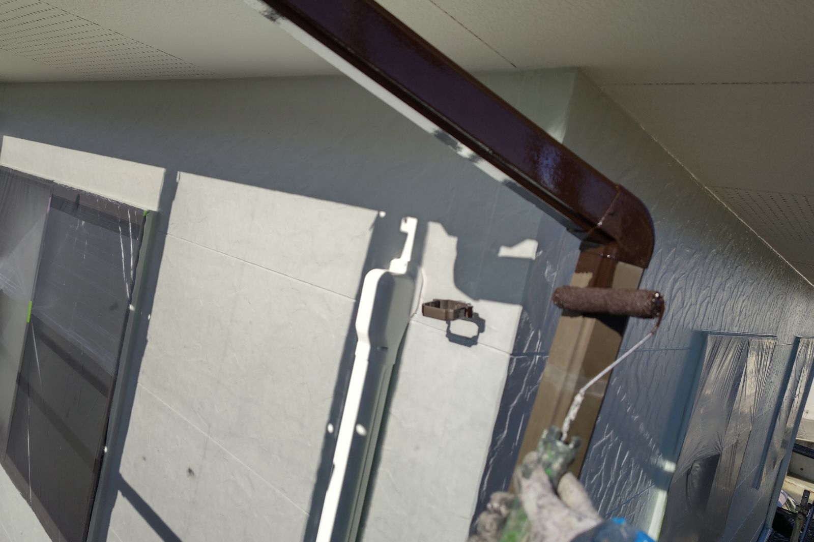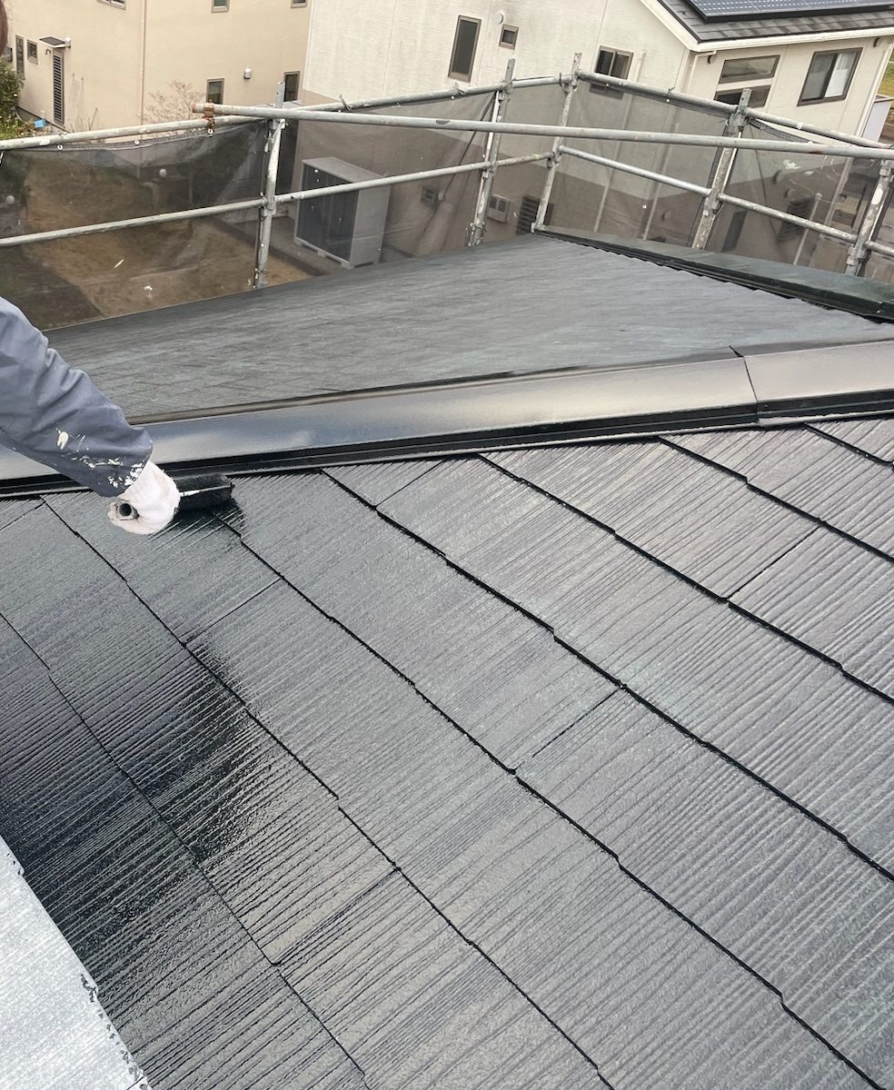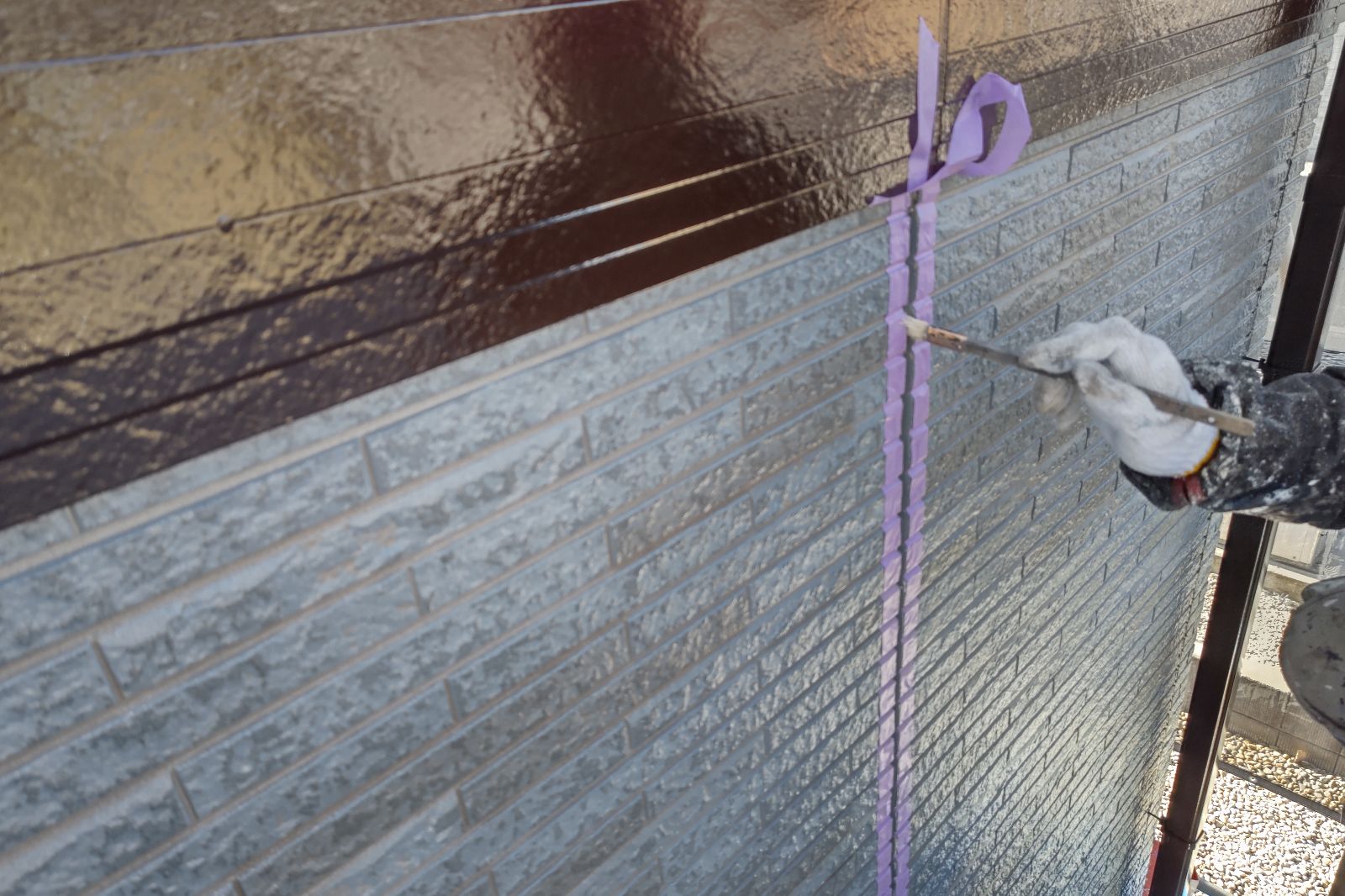 上塗り。意匠性の高いサイディング外壁のデザインをそのまま残すことができる外壁用クリヤー塗料「スーパーSDクリヤー無機-JY」で施工しました。