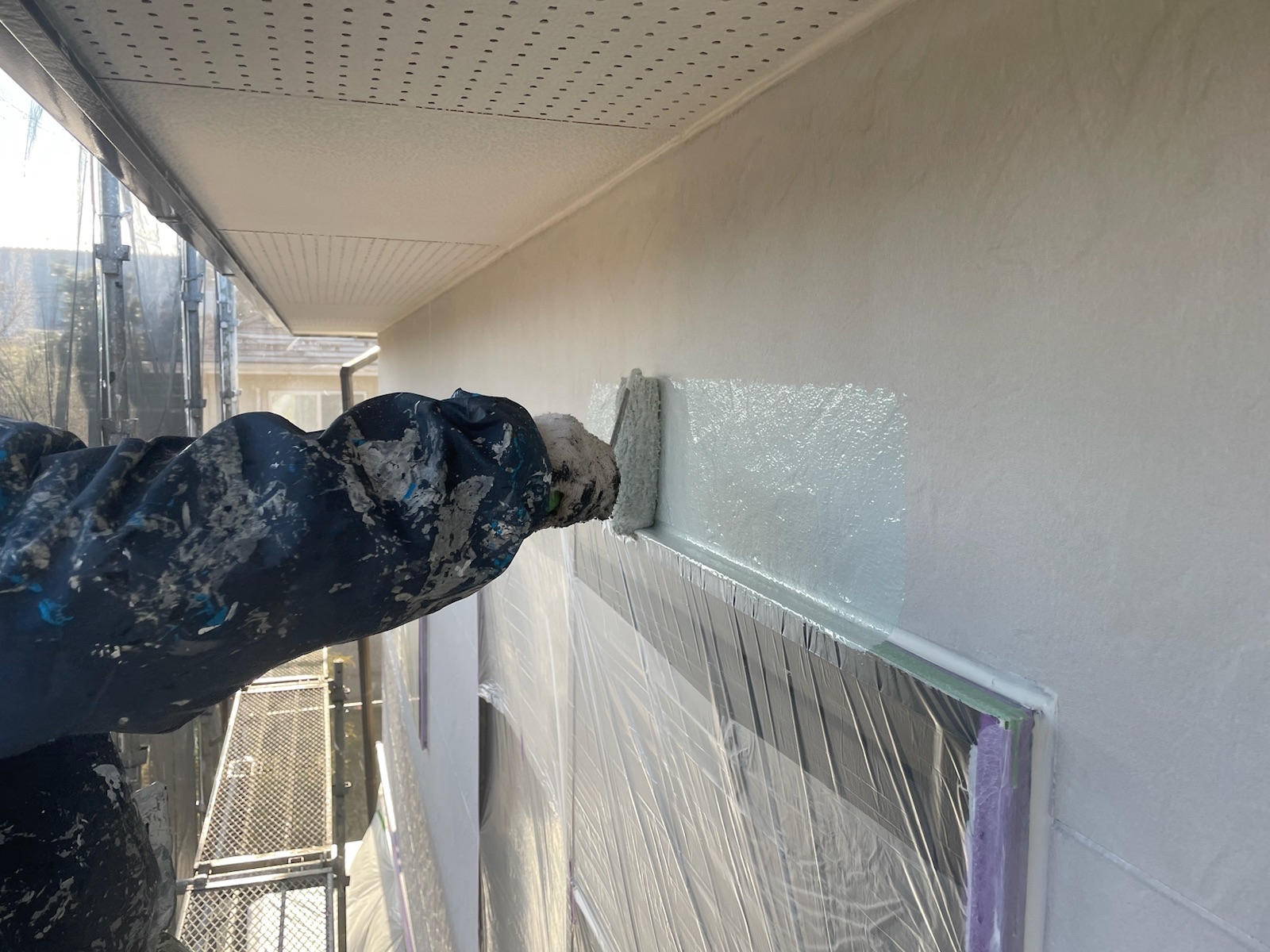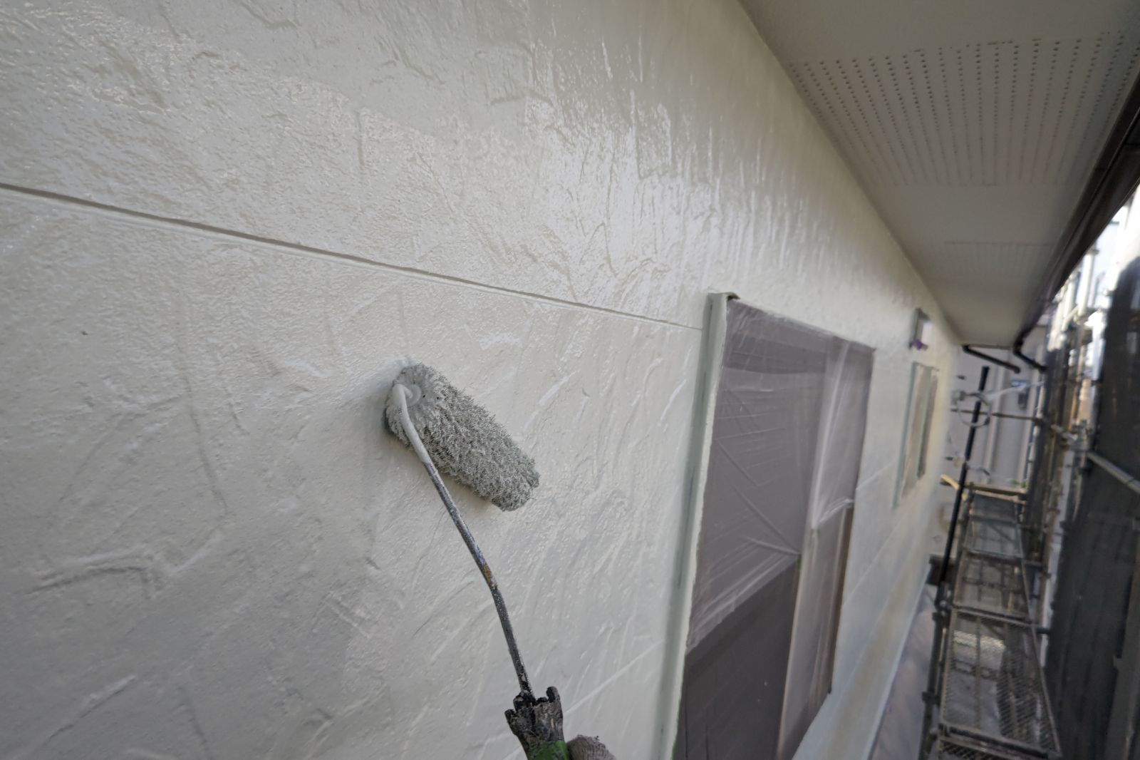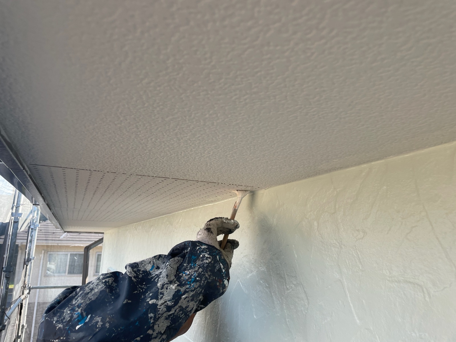 上塗り。意匠性の高いサイディング外壁のデザインをそのまま残すことができる外壁用クリヤー塗料「スーパーSDクリヤー無機-JY」で施工しました。