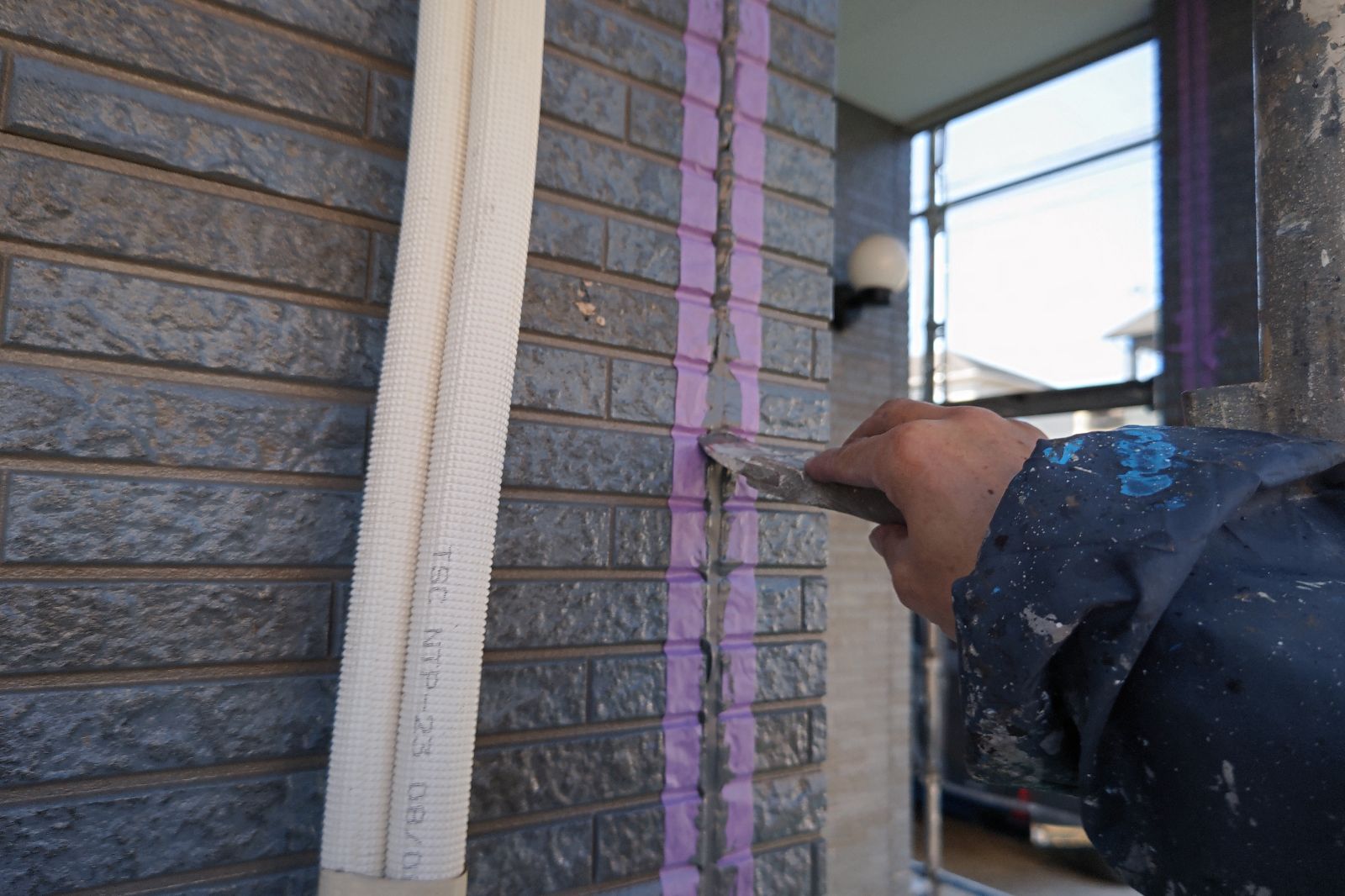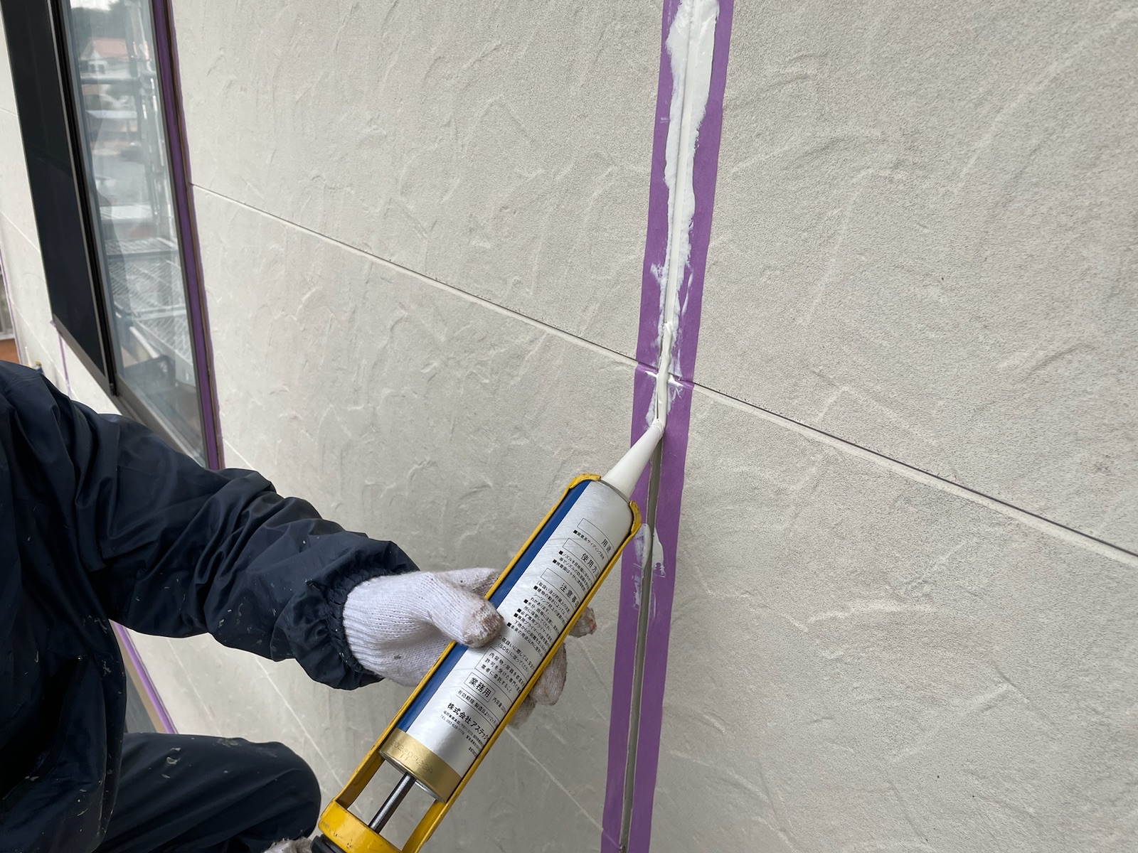 コーキング材の充填。目地内部に空洞ができないように多めに注入していきます。