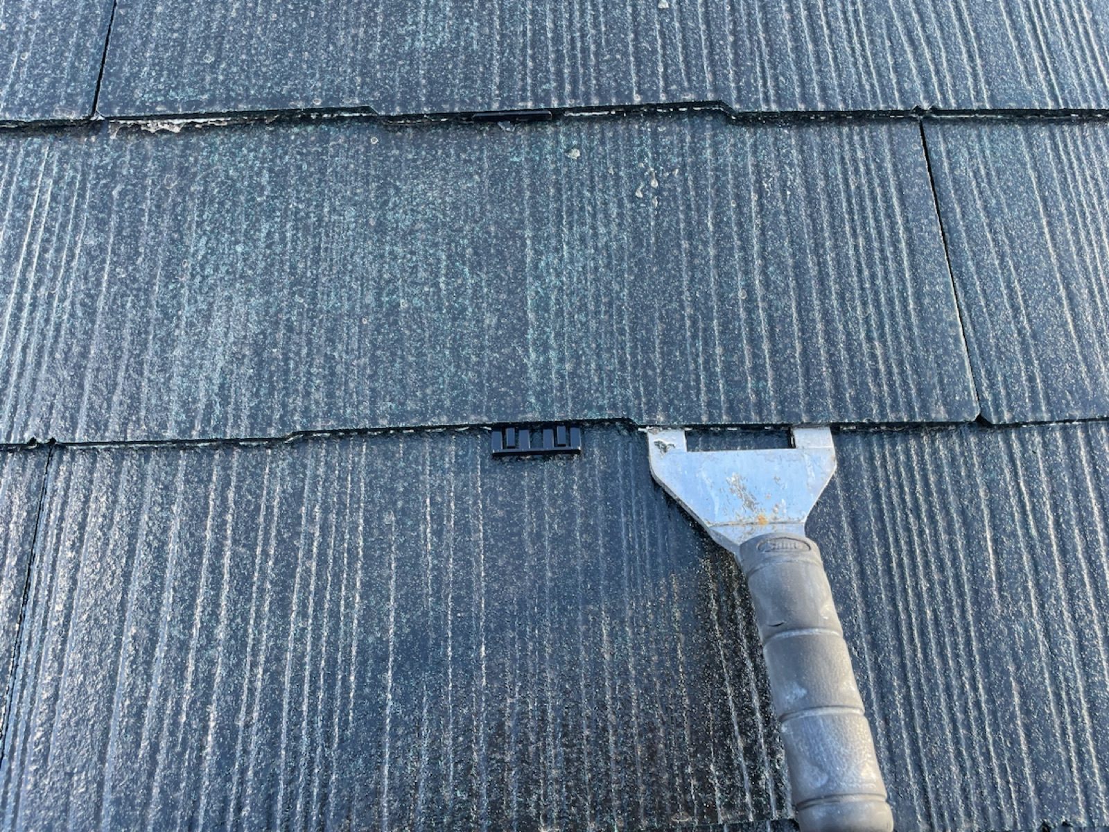タスペーサー取付け。屋根材同士がくっつくのを防ぐ縁切りをタスペーサーで行います。