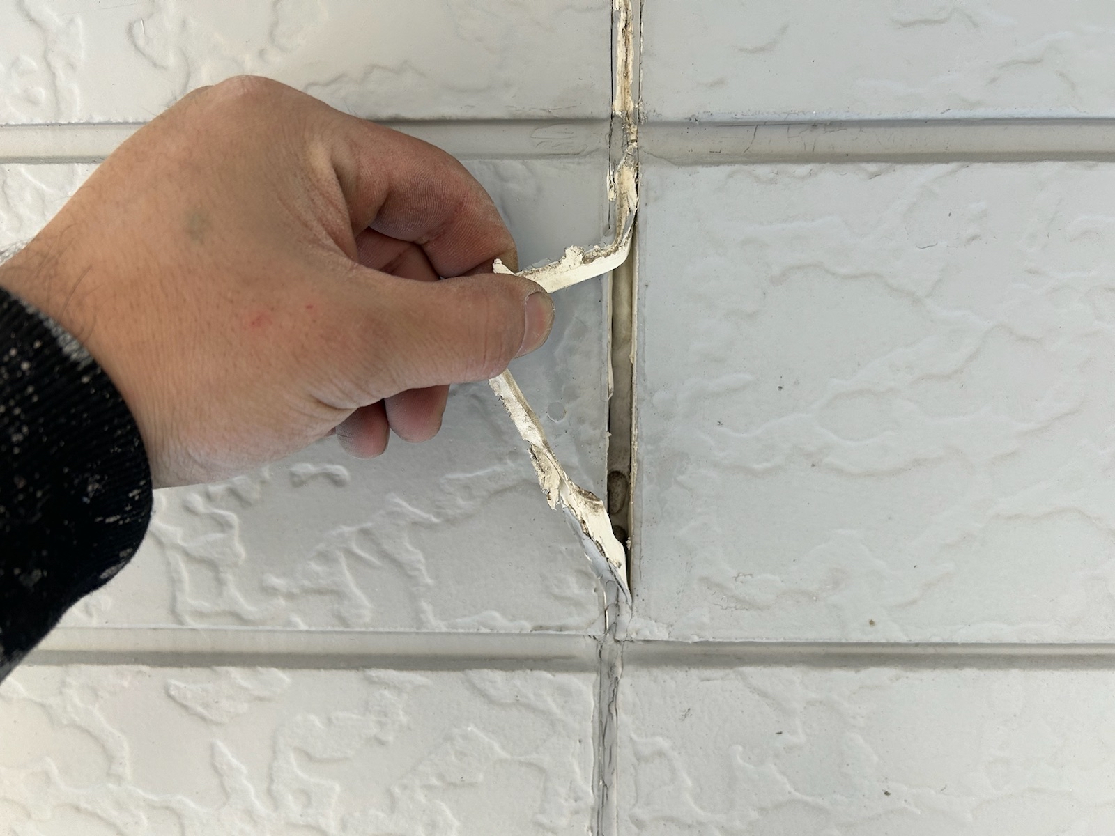 既存のコーキングの撤去。撤去後は、目地に残った埃をハケを使って綺麗にとります。