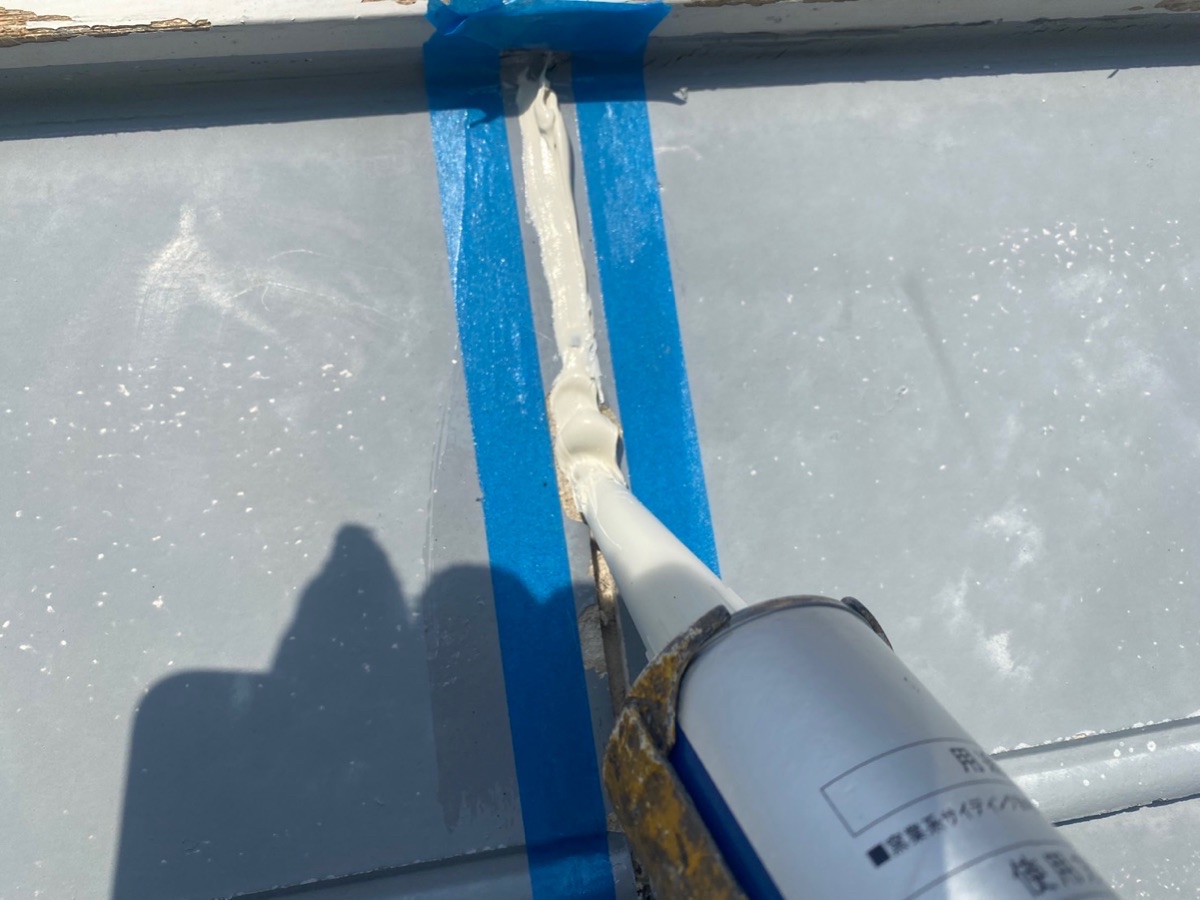 コーキング材の充填。目地内部に空洞ができないように多めに注入していきます。