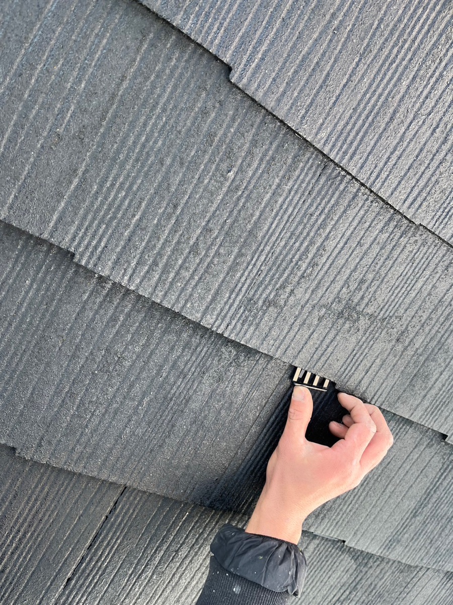タスぺーサー取付け。屋根材同士がくっつくのを防ぐ縁切りをタスペーサーで行います。