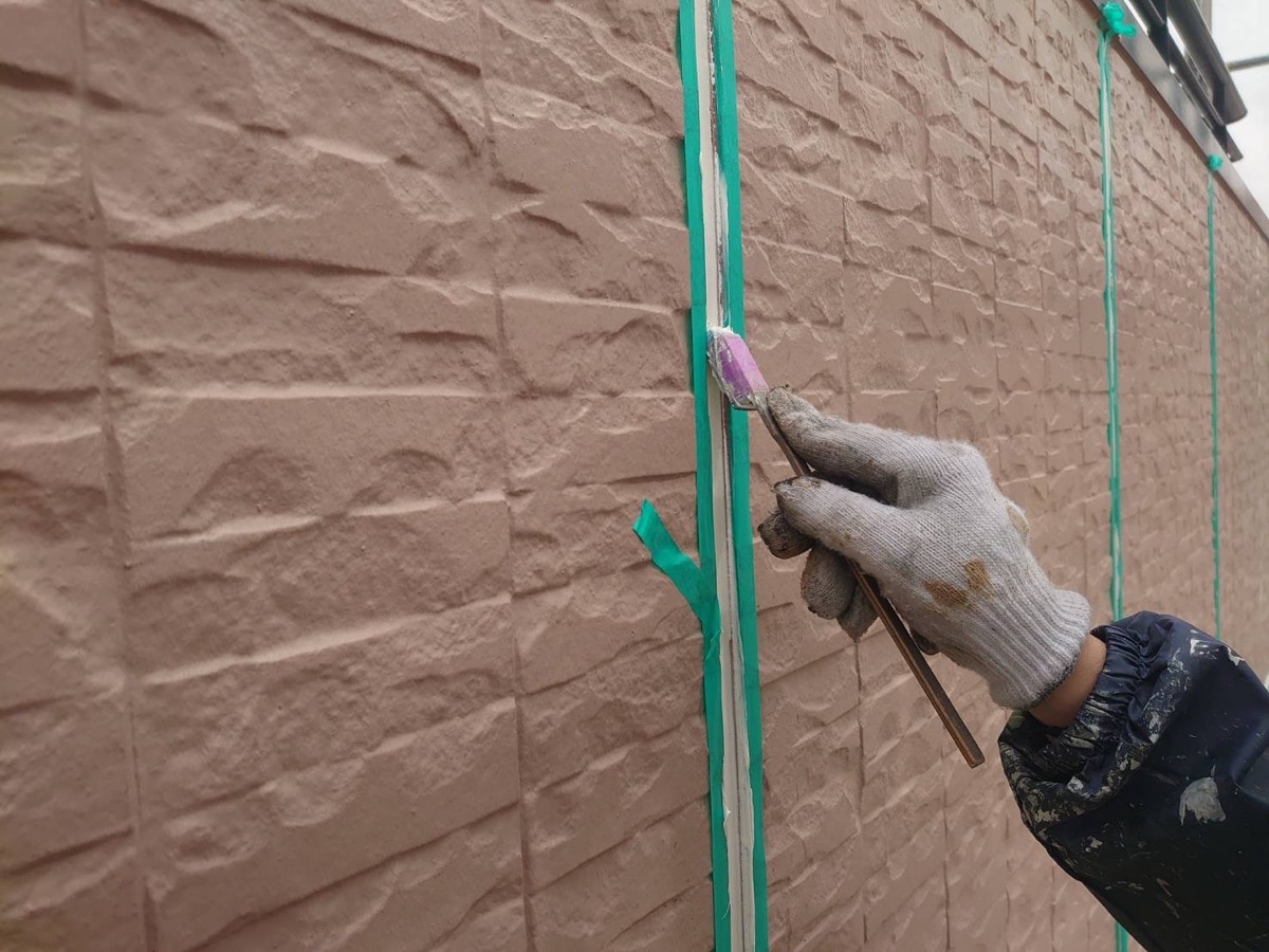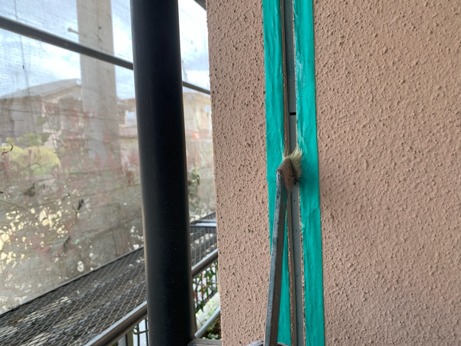 既存のコーキングの撤去。撤去後は、目地に残った埃をハケを使って綺麗にとります。
