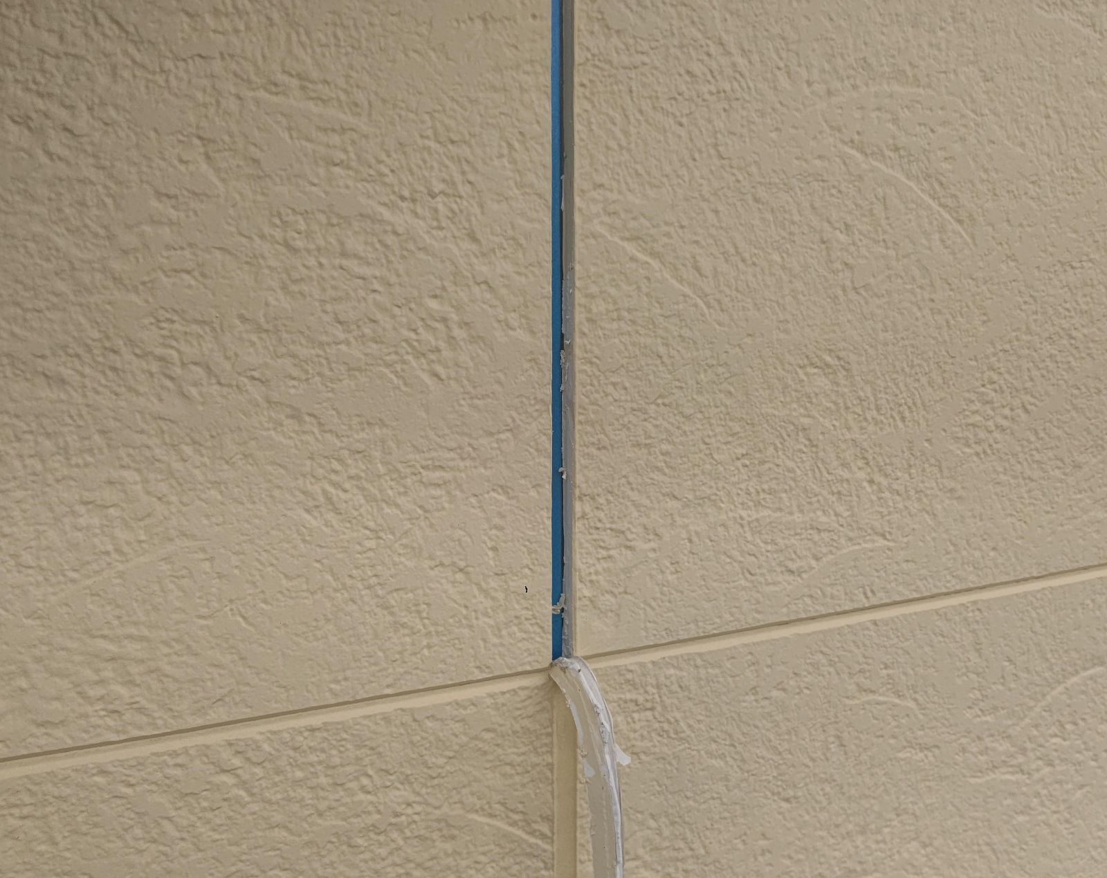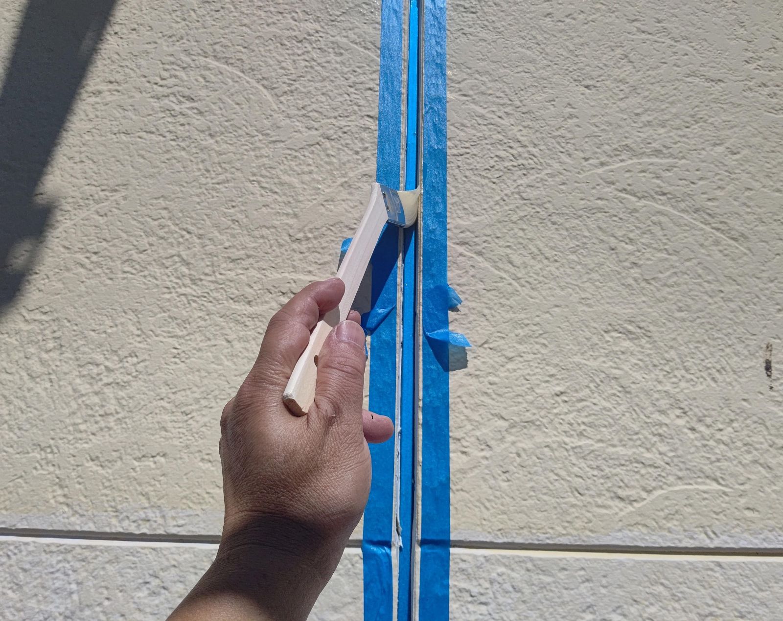 コーキング材の充填。目地内部に空洞ができないように多めに注入していきます。