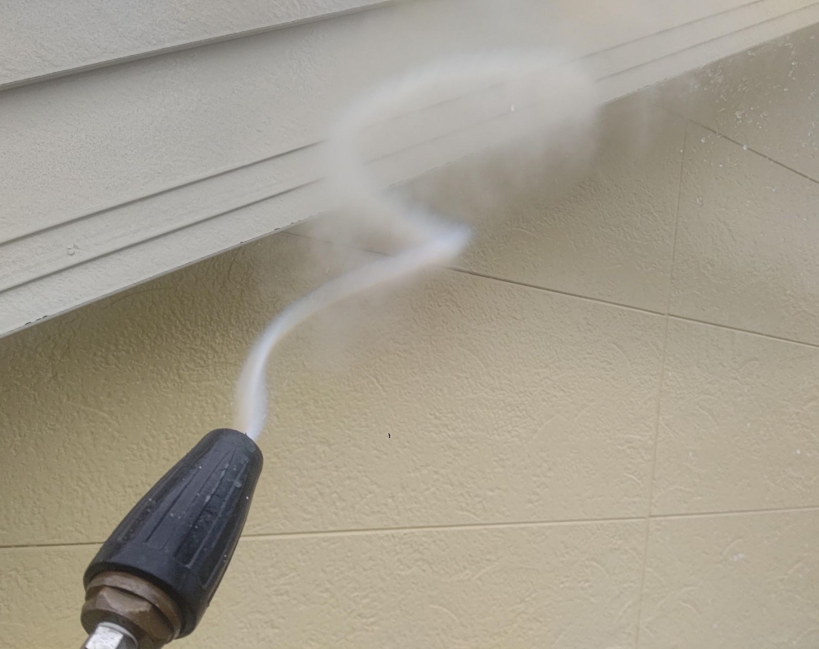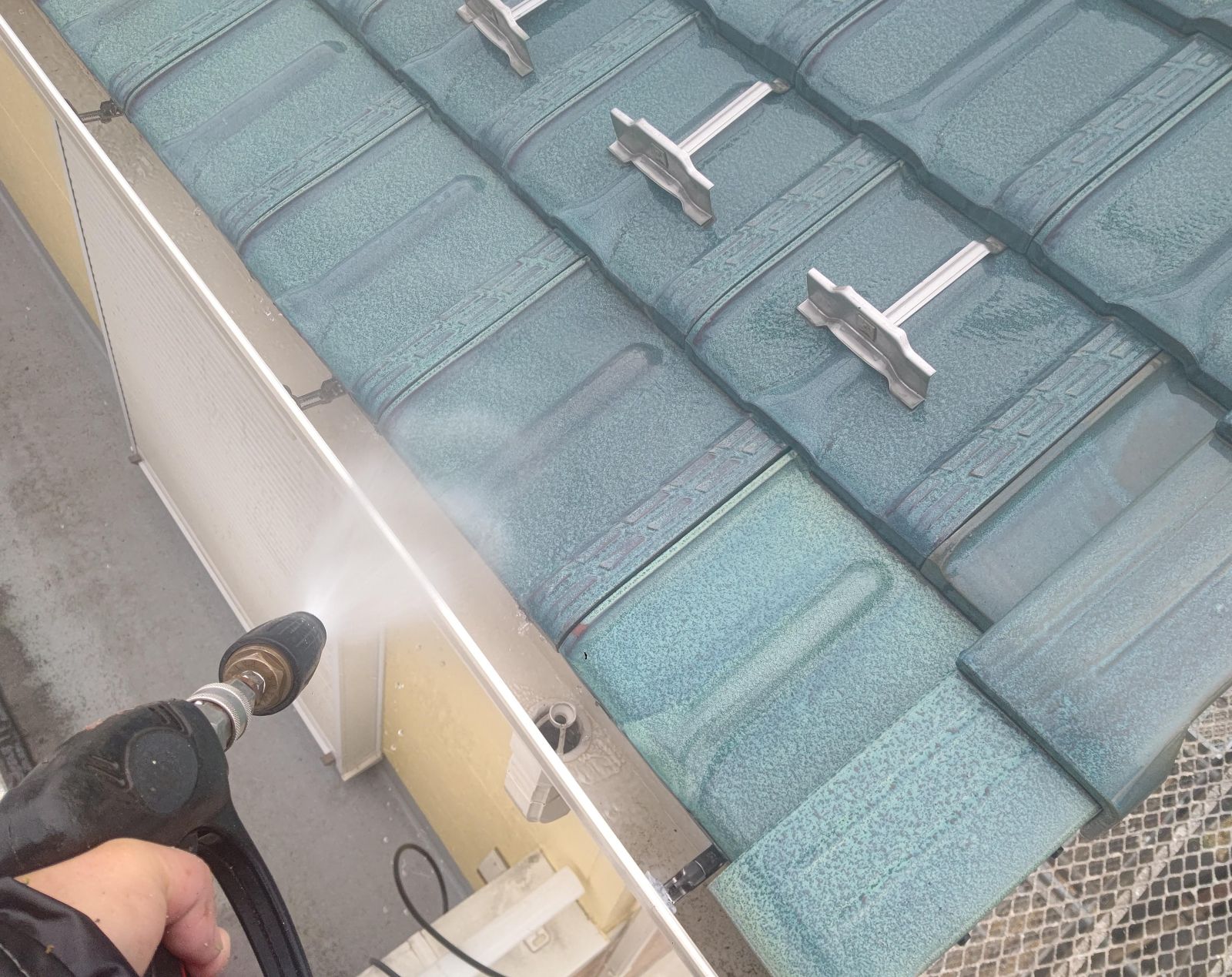 塗料と建材の密着を強くするために外壁や屋根に付着した埃・苔・汚れなどを隅々まで洗浄します。