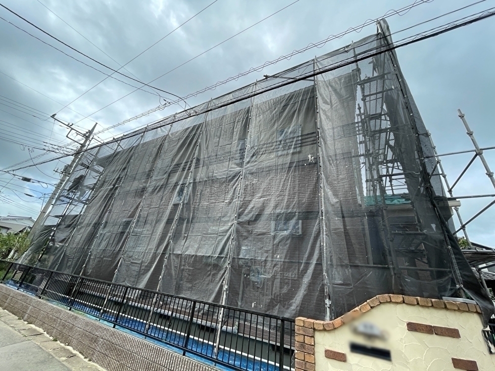 専門業者が足場を組み立てます。その際に、洗浄水や塗料の飛散を防止するシートを足場全体に掛けます。