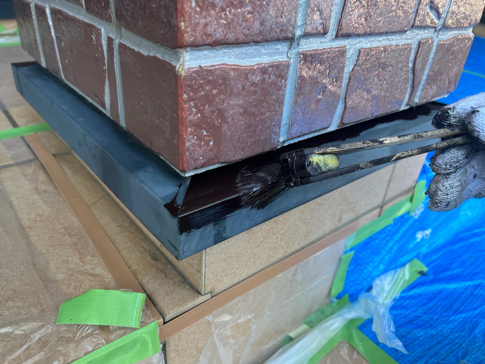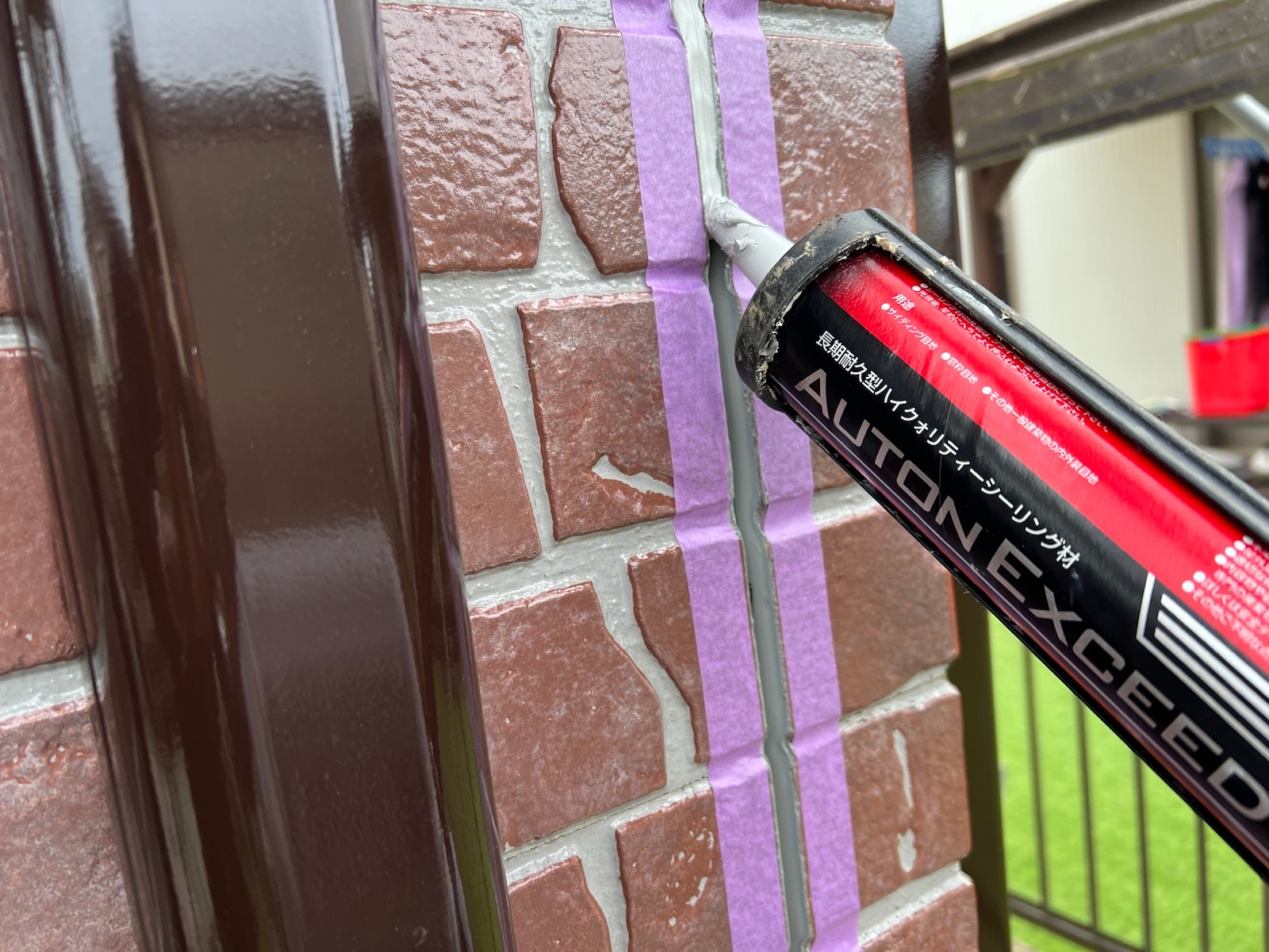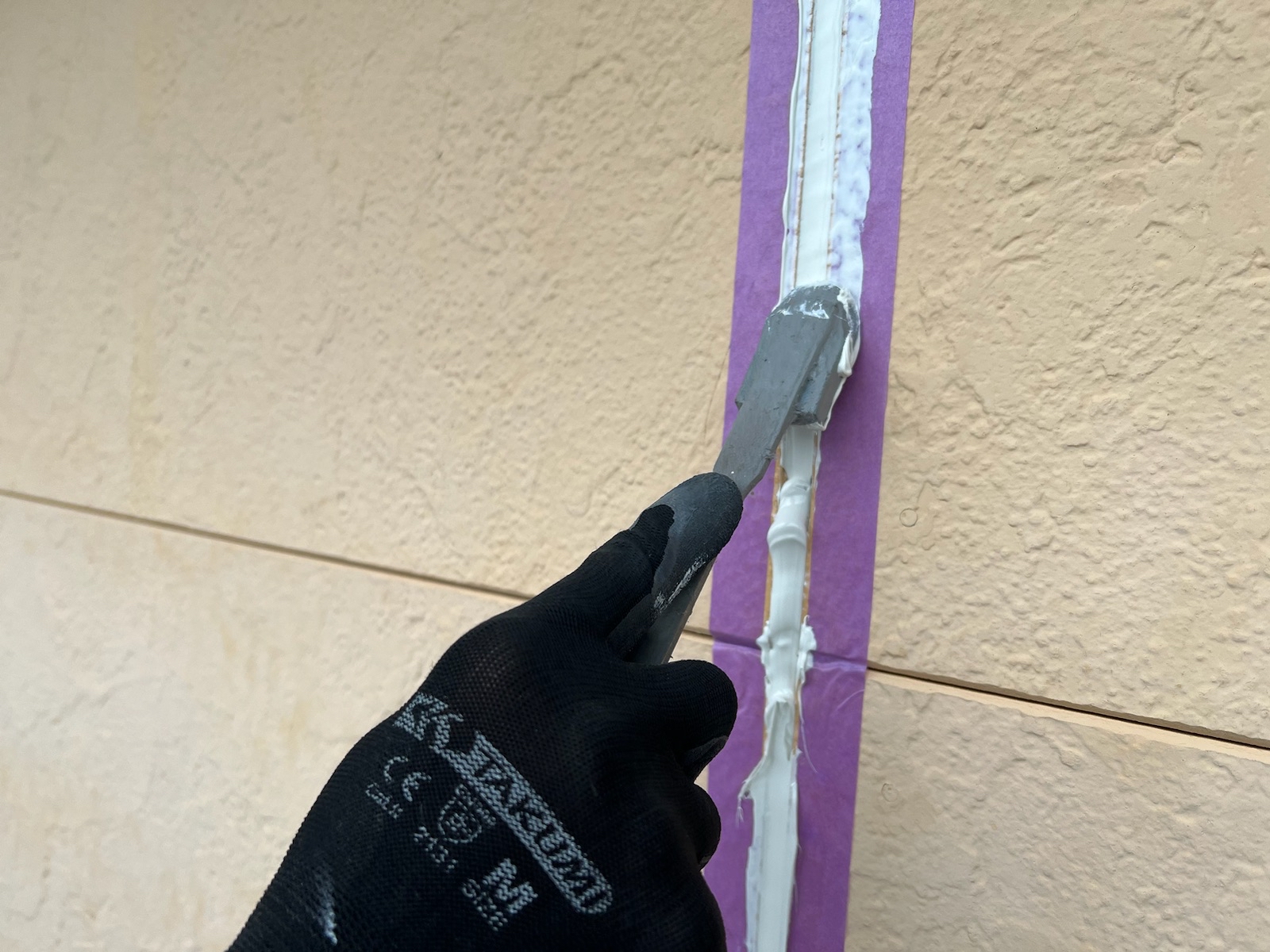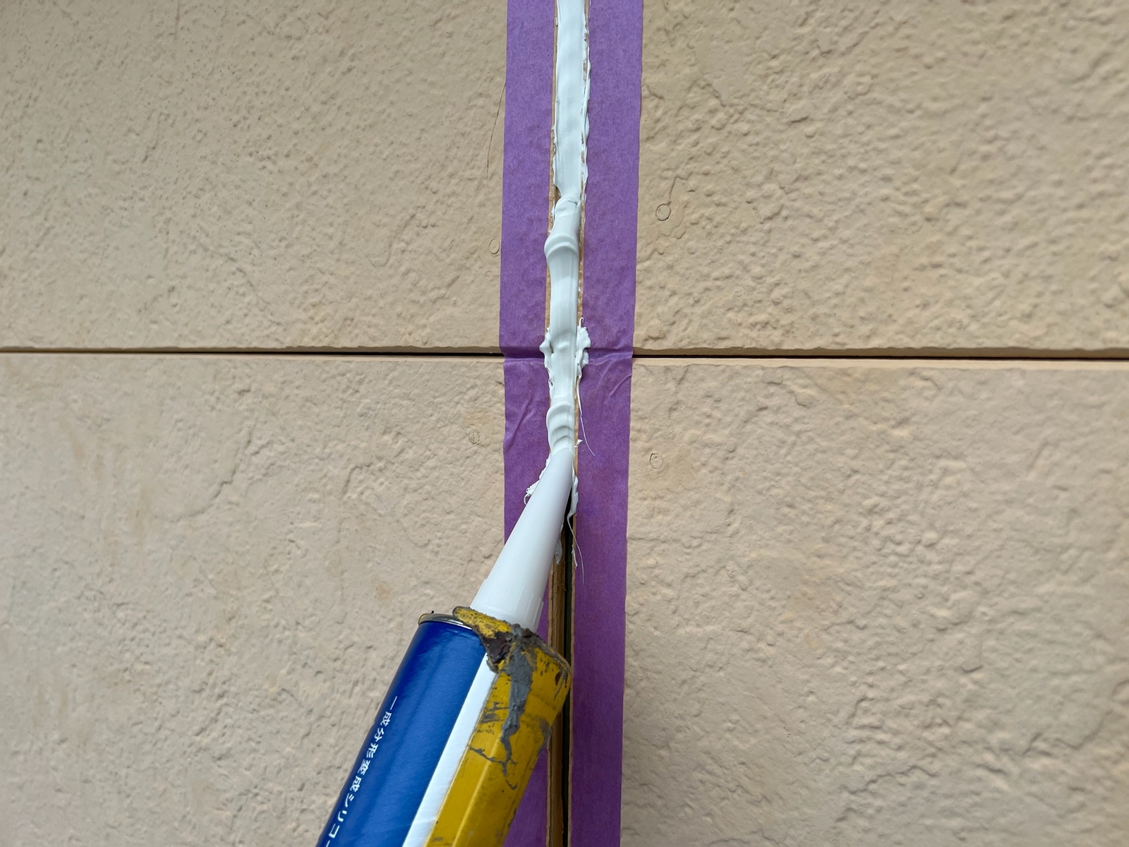 コーキング材の充填。目地内部に空洞ができないように多めに注入していきます。