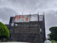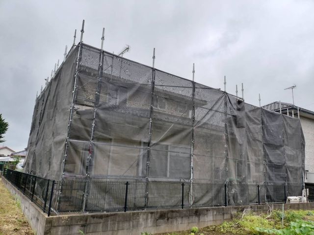 専門業者が足場を組み立てます。その際に、洗浄水や塗料の飛散を防止するシートを足場全体に掛けます。