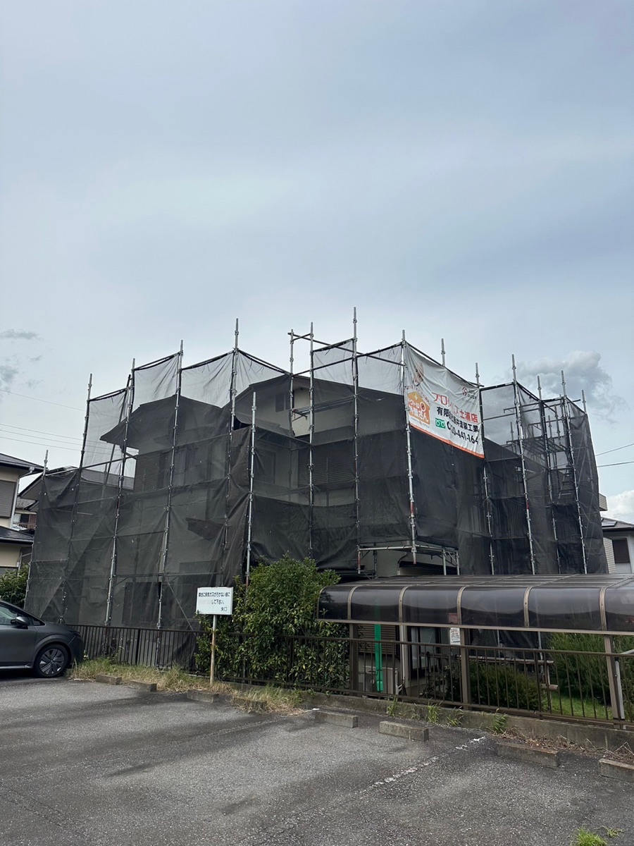 専門業者が足場を組み立てます。その際に、洗浄水や塗料の飛散を防止するシートを足場全体に掛けます。