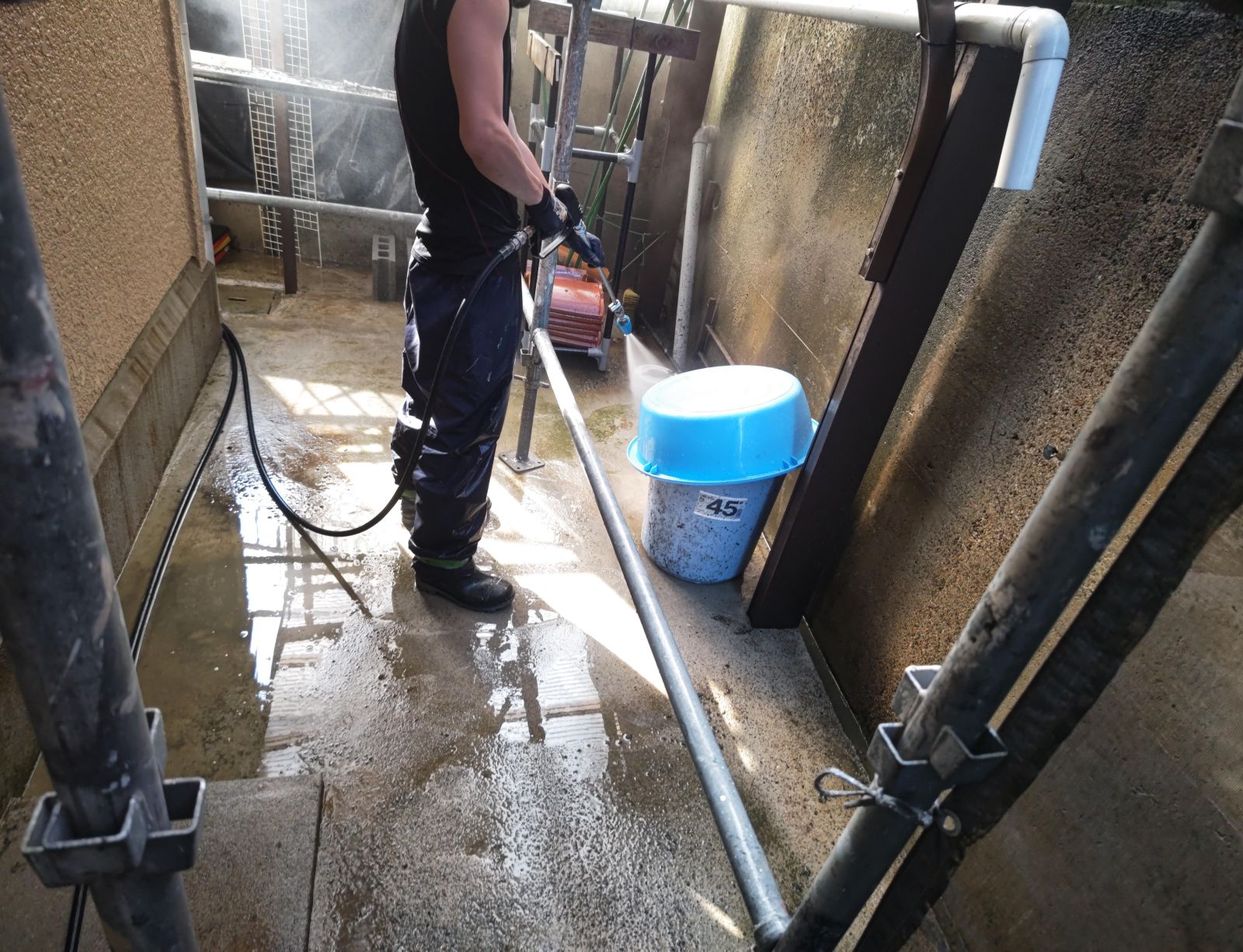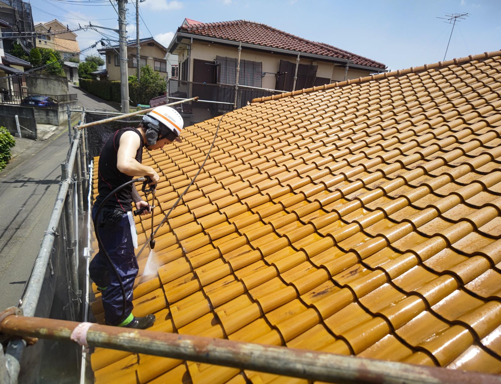 塗料と建材の密着を強くするために外壁や屋根に付着した埃・苔・汚れなどを隅々まで洗浄します。