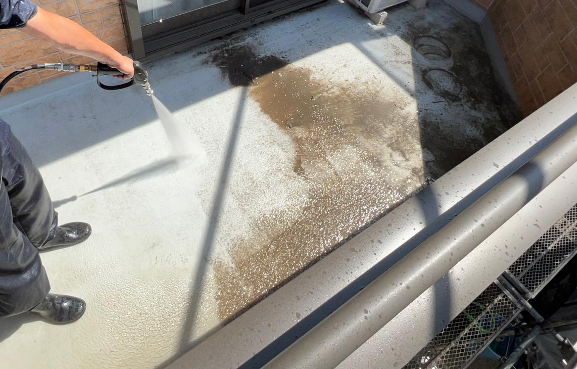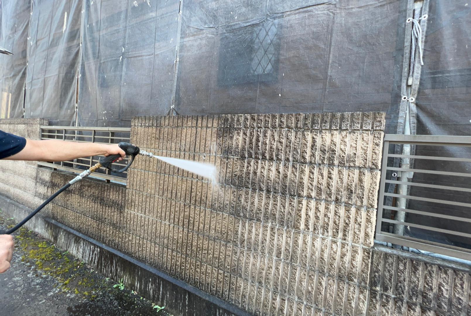 塗料と建材の密着を強くするために外壁や屋根に付着した埃・苔・汚れなどを隅々まで洗浄します。