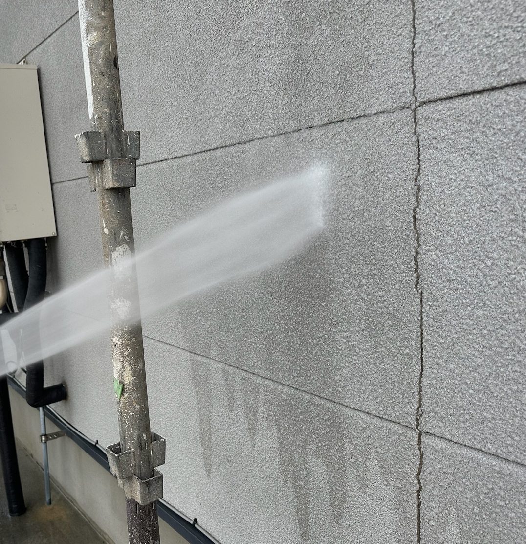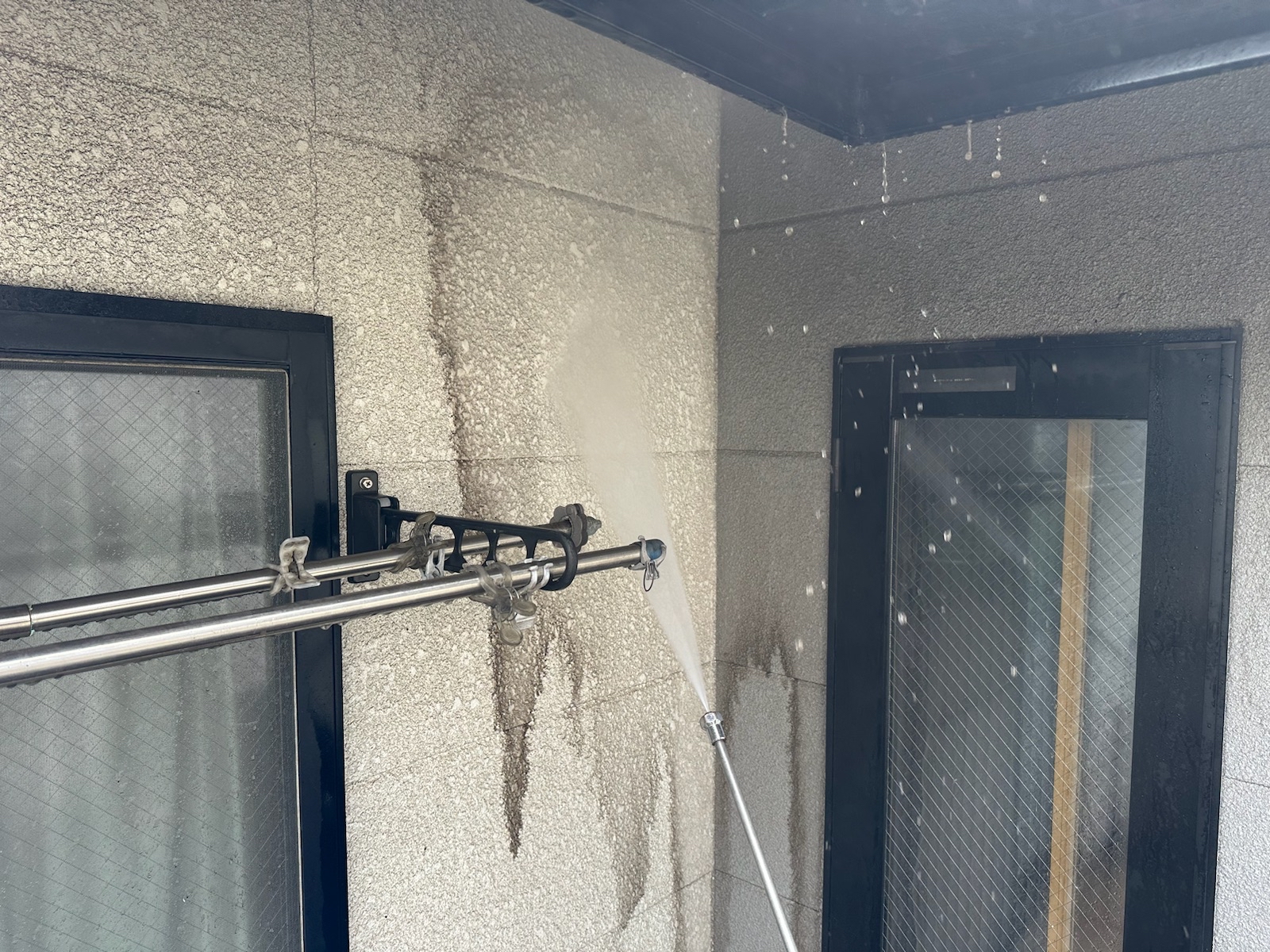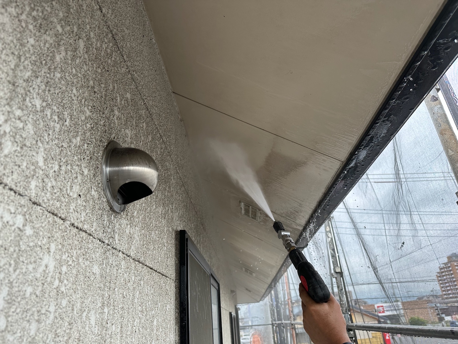 塗料と建材の密着を強くするために外壁や屋根に付着した埃・苔・汚れなどを隅々まで洗浄します。