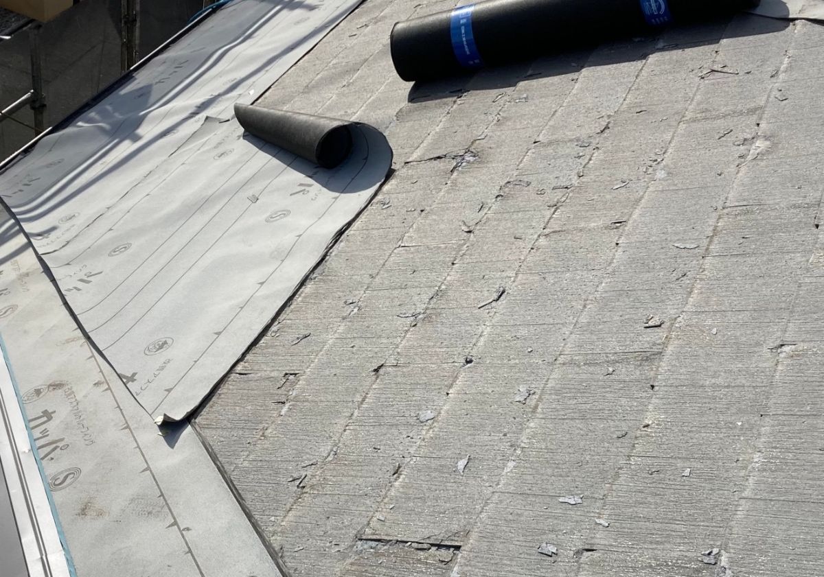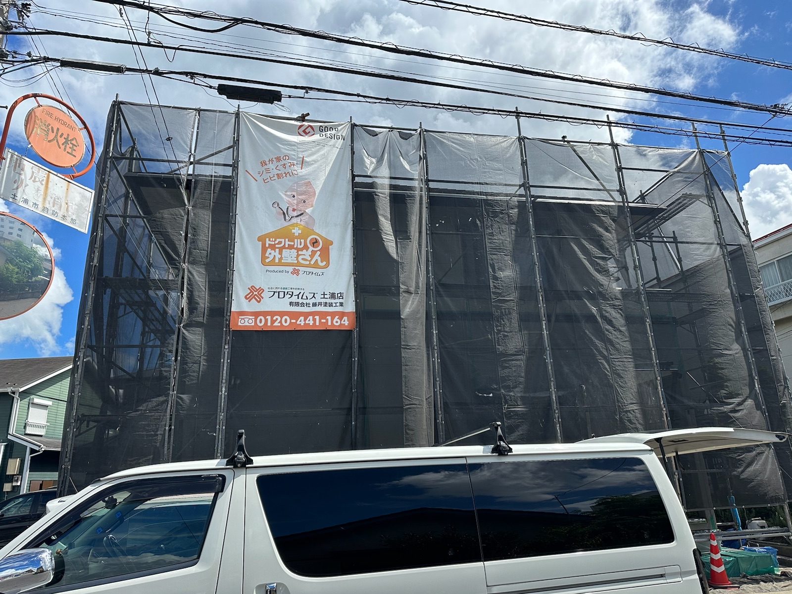 専門業者が足場を組み立てます。その際に、洗浄水や塗料の飛散を防止するシートを足場全体に掛けます。