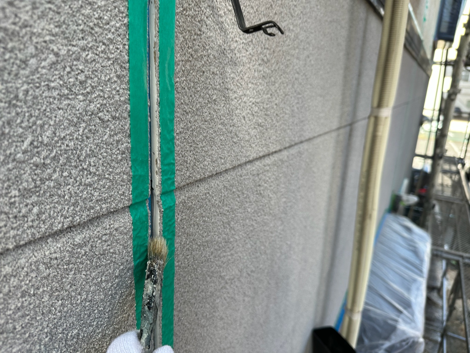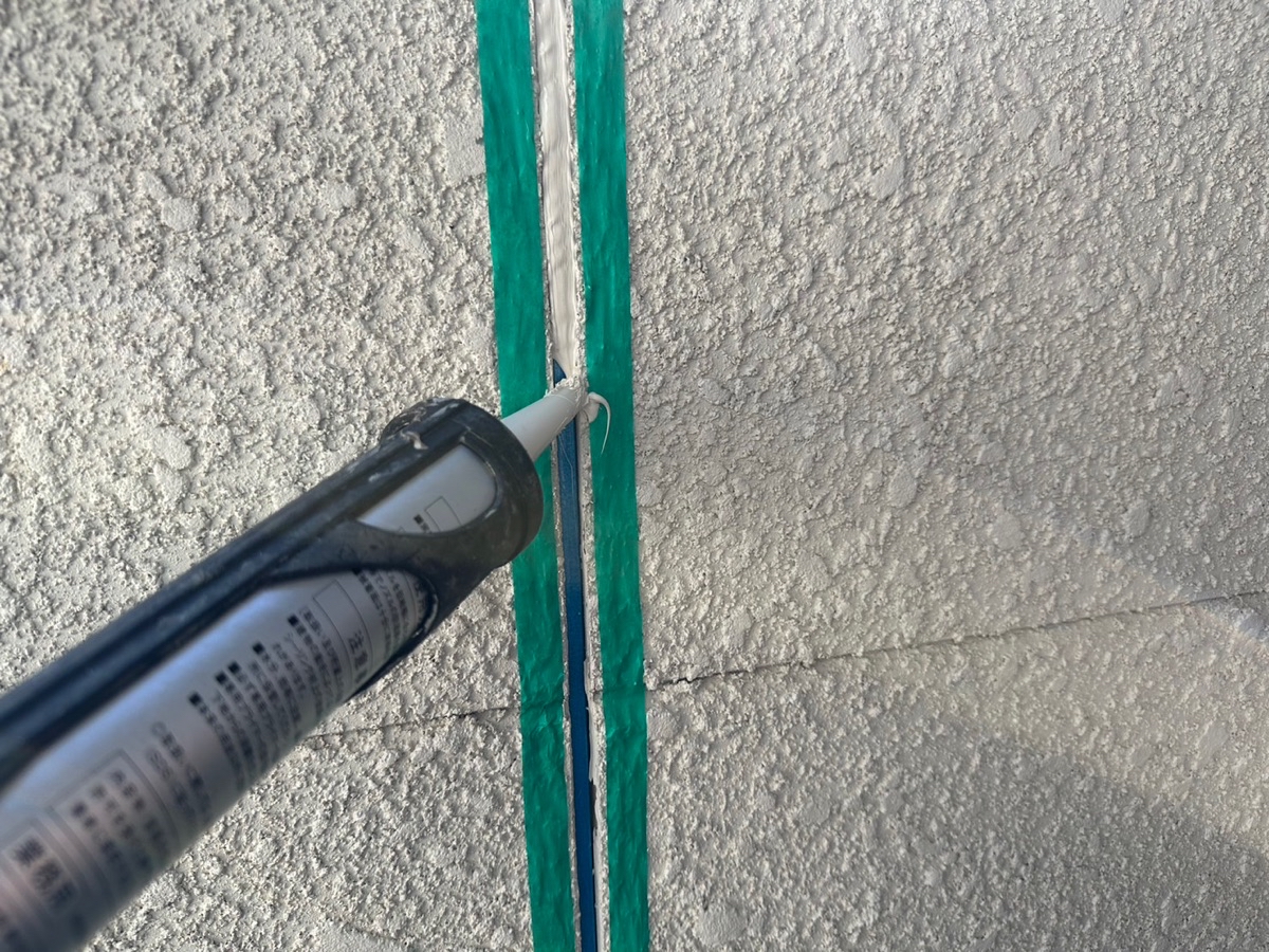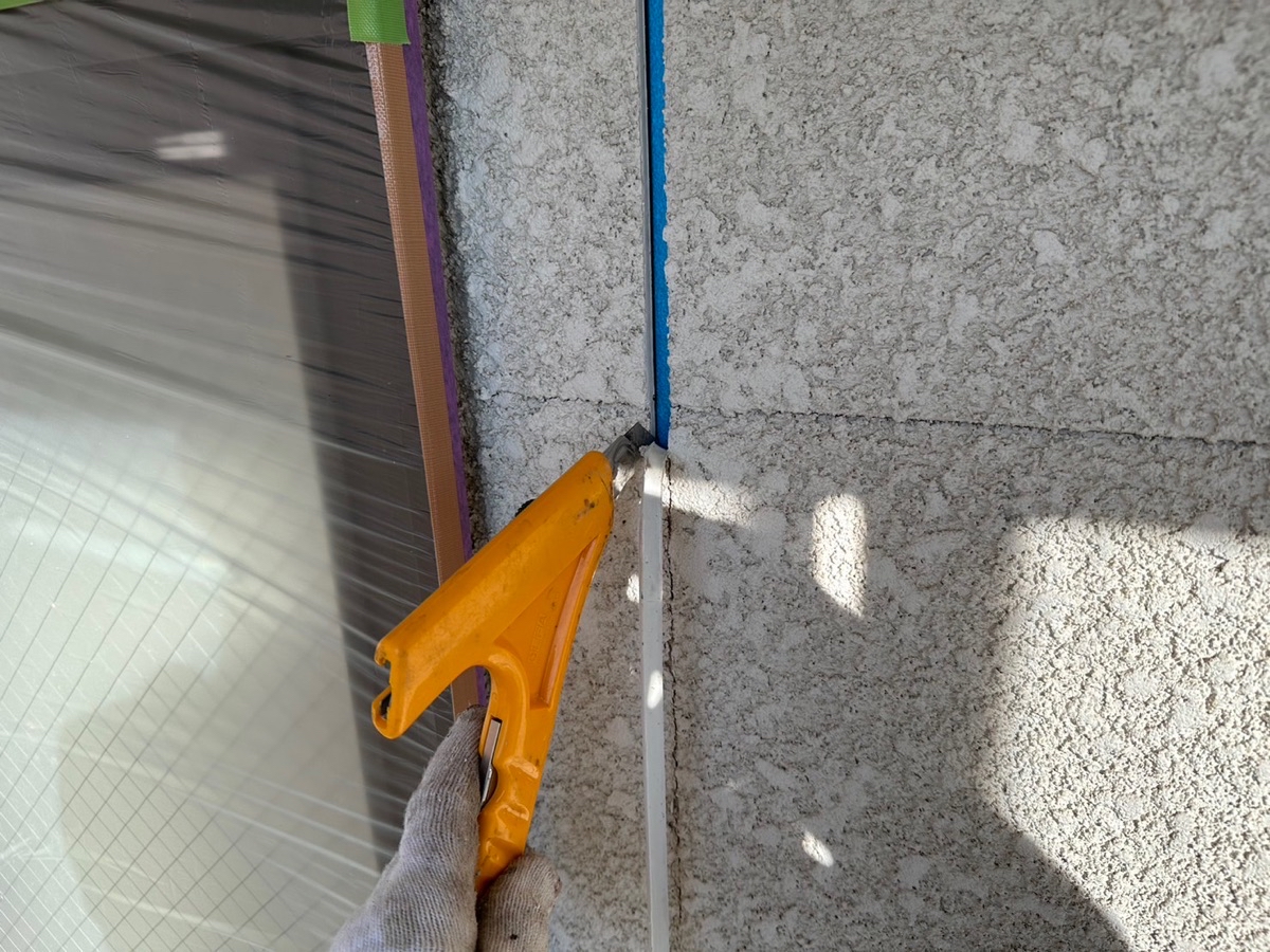 コーキング材の充填。目地内部に空洞ができないように多めに注入していきます。