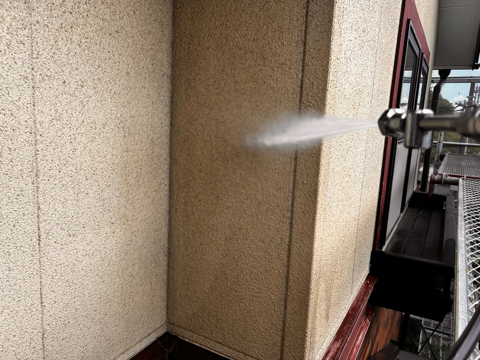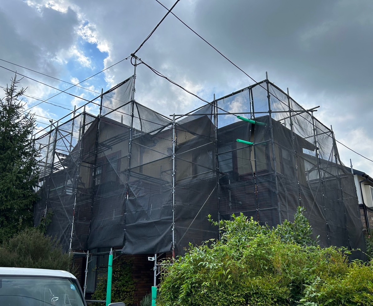 専門業者が足場を組み立てます。その際に、洗浄水や塗料の飛散を防止するシートを足場全体に掛けます。