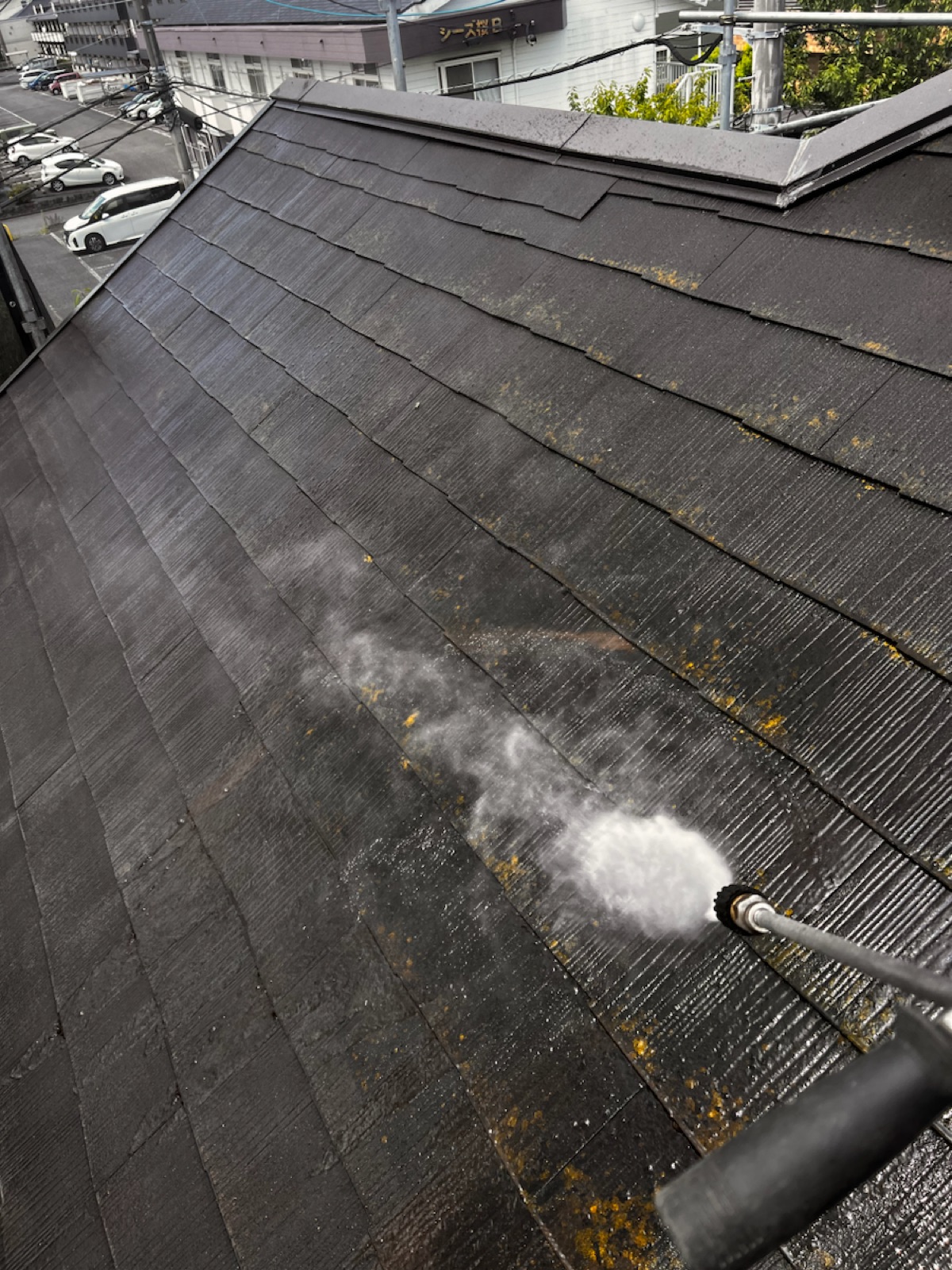 塗料と建材の密着を強くするために外壁や屋根に付着した埃・苔・汚れなどを隅々まで洗浄します。