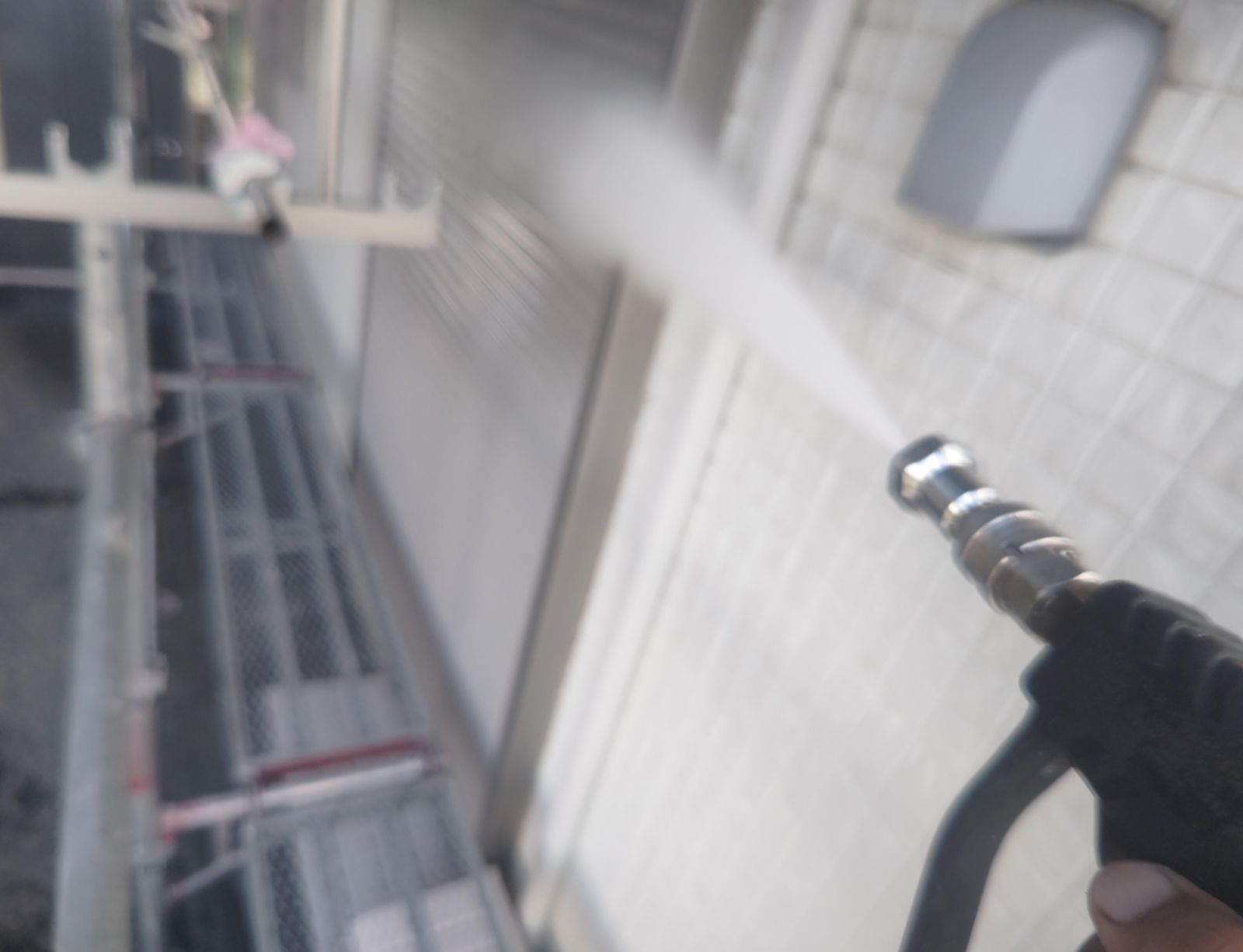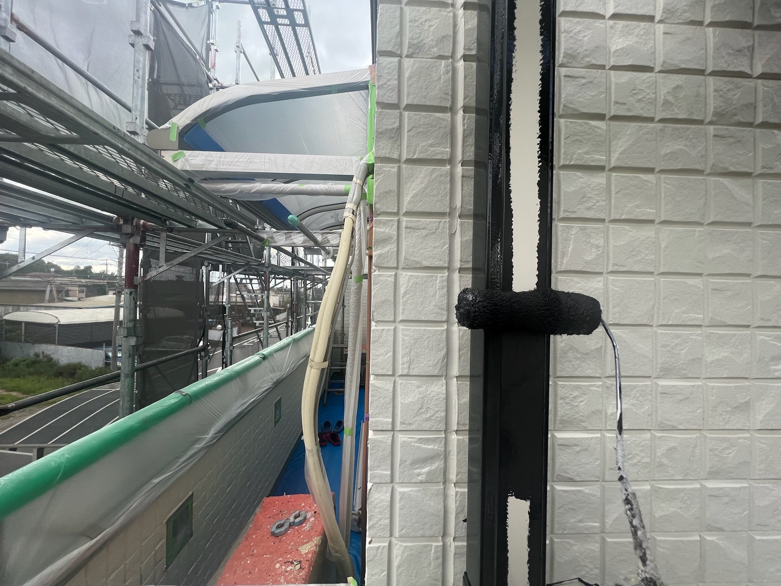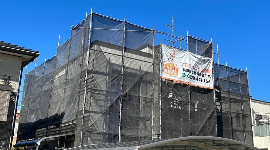 専門業者が足場を組み立てます。その際に、洗浄水や塗料の飛散を防止するシートを足場全体に掛けます。