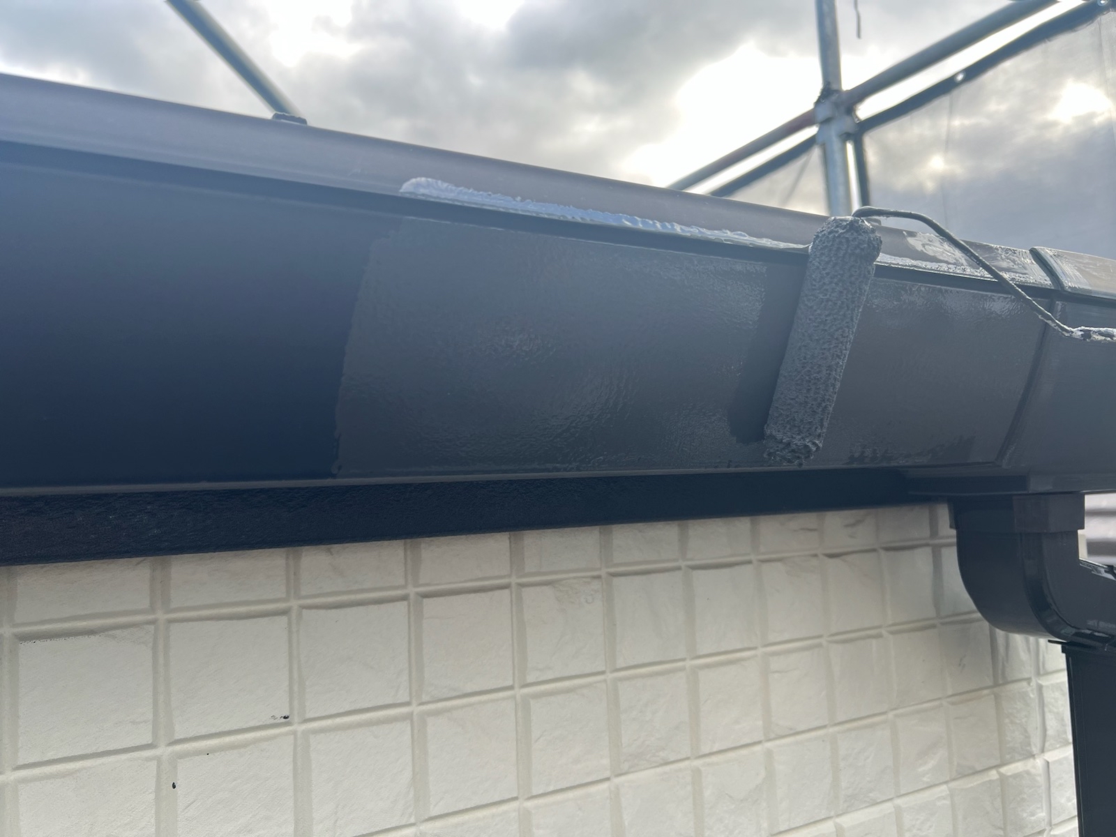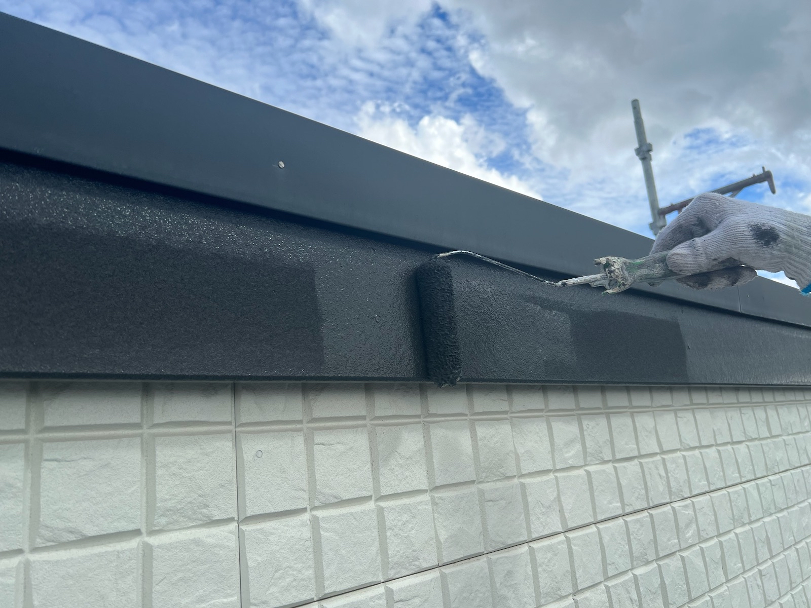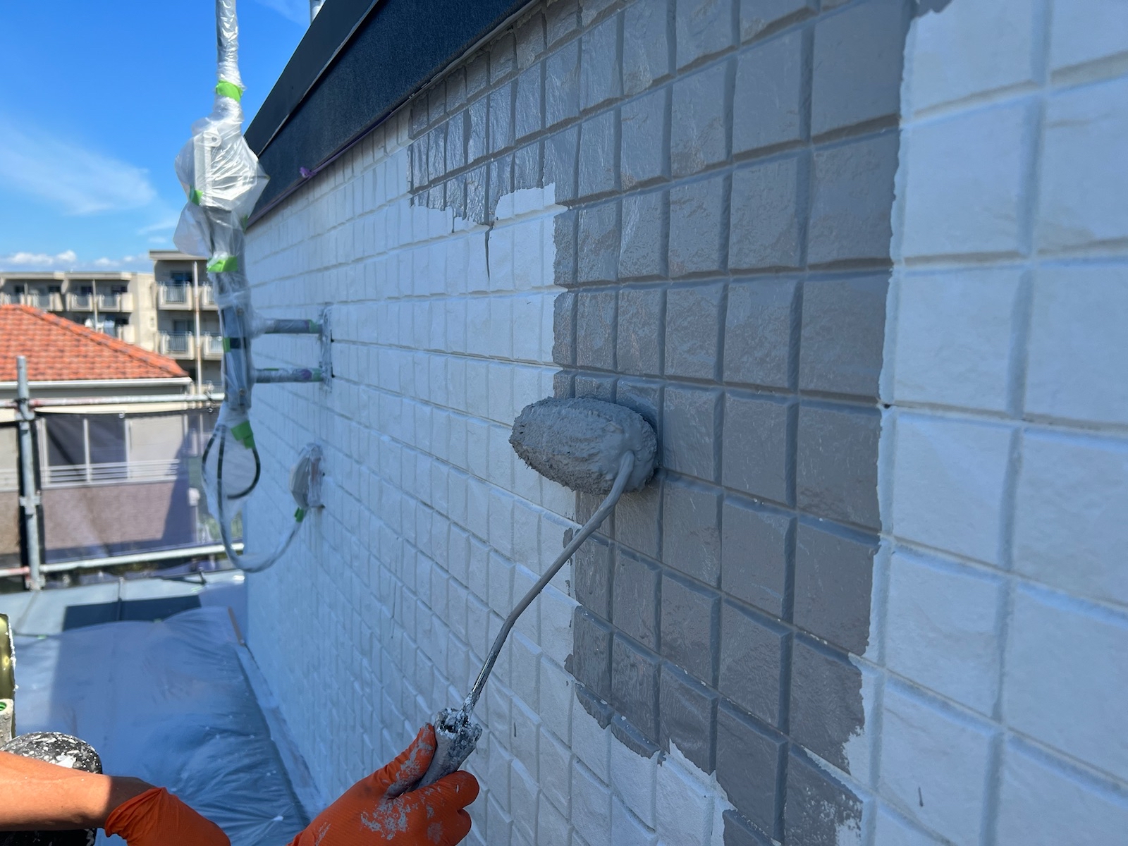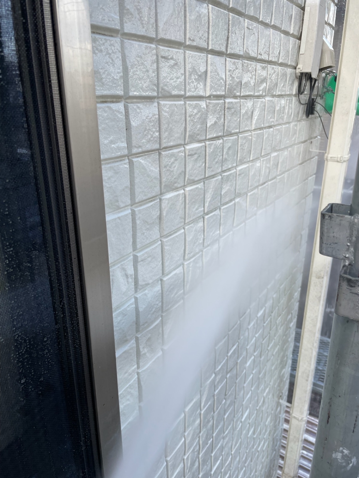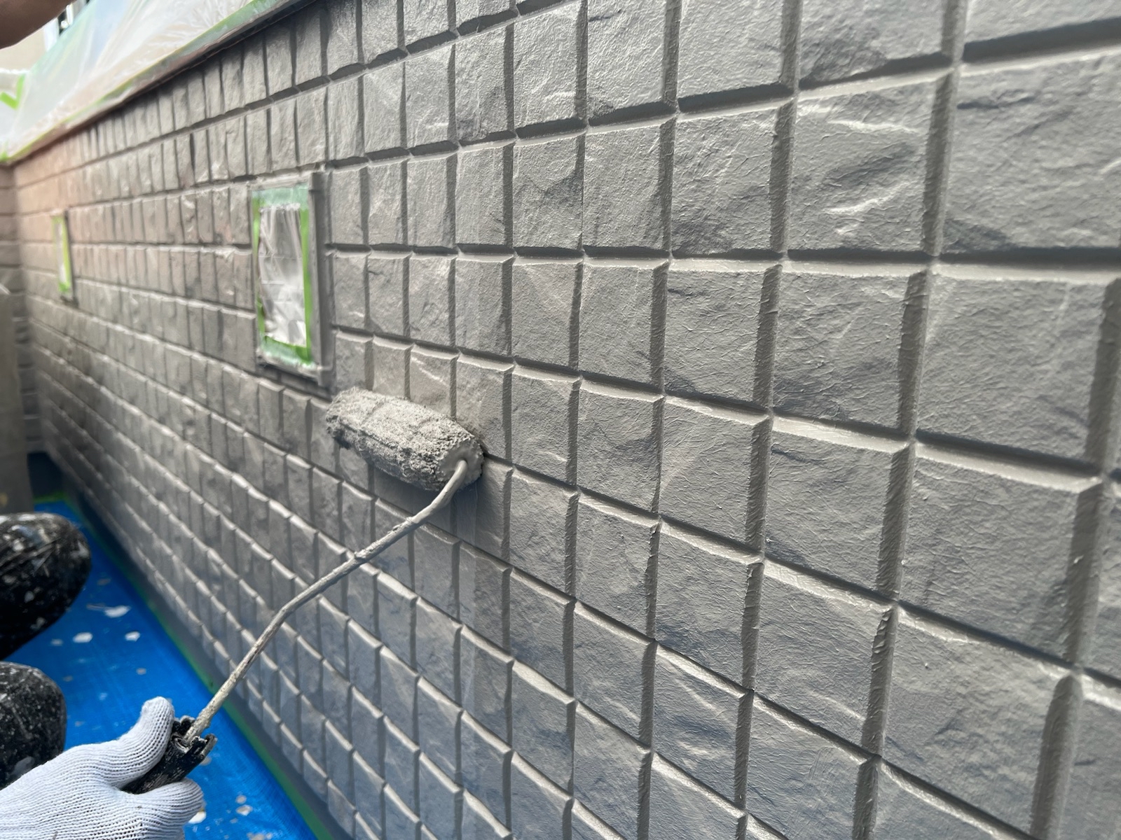 上塗り(バーチグレー)業界最高水準の外壁の美観を保持する超低汚染無機フッ素塗料「超低汚染プラチナリファイン2000MF-IR」で施工しました。