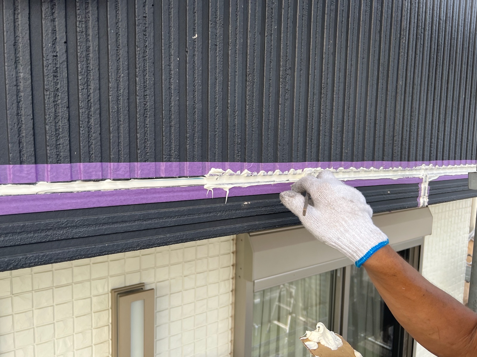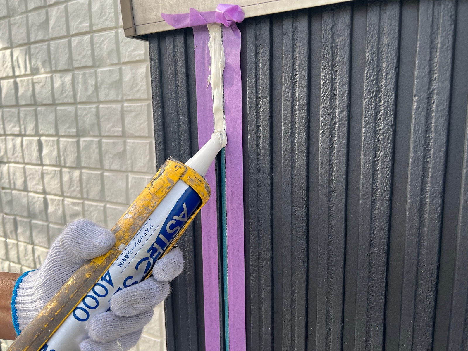 既存のコーキングは撤去せずにコーキング材を充填します。十分な厚みが確保できるようにたっぷりと!!