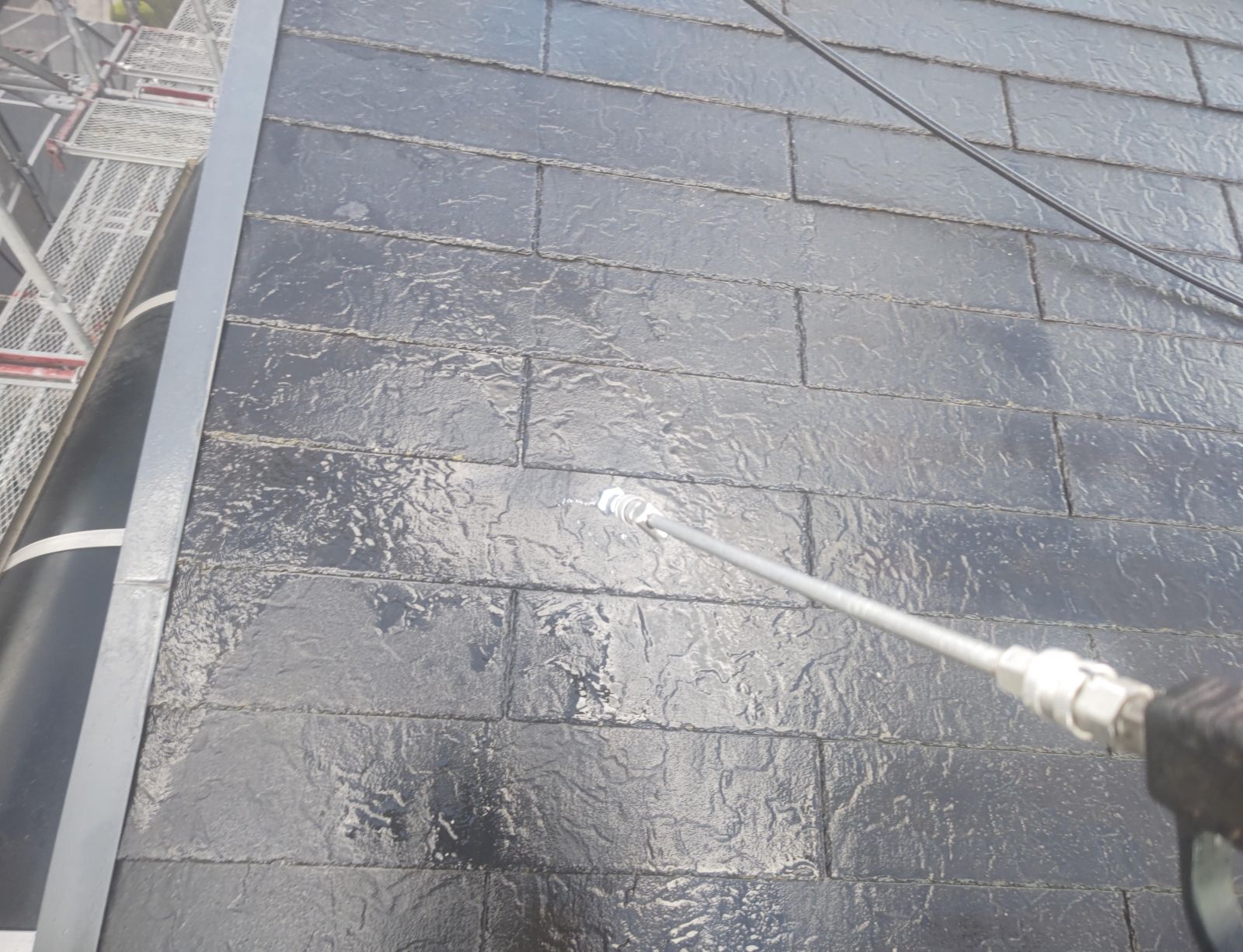 塗料と建材の密着を強くするために外壁や屋根に付着した埃・苔・汚れなどを隅々まで洗浄します。