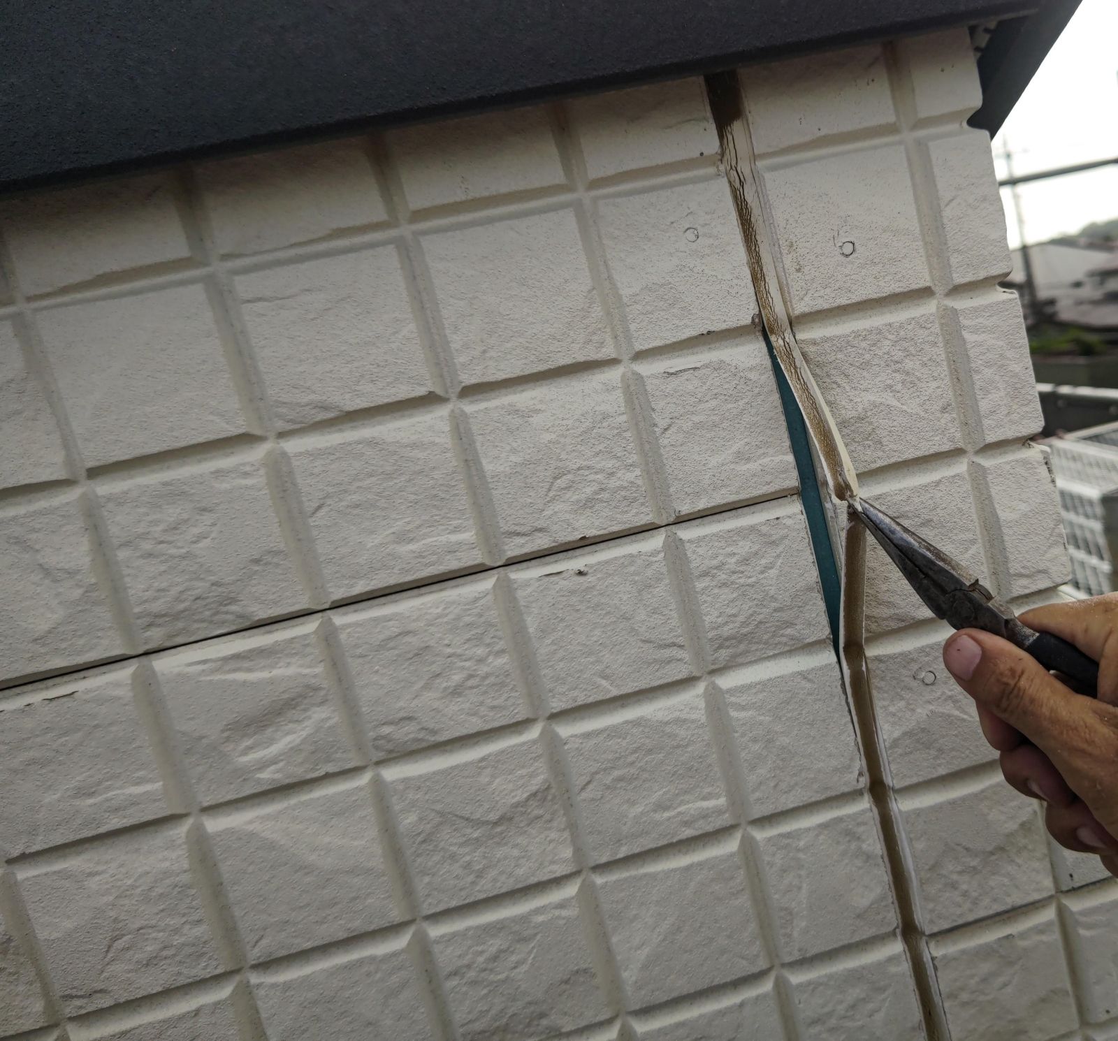 コーキング撤去後は、目地に残った埃をハケを使って綺麗にとります。