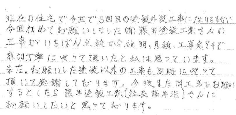 現在の住宅で今回で5回目の塗装外壁工事になりますが今回初めてお願いしました。(有)藤井塗装工業さんの工事がいちばん点検から、説明、見積、工事完了まで親切、丁寧にやって頂いたと私は思っています。また、お願いした塗装以外の工事も同期にやって頂いて感謝しております。今後また同工事をお願いするとしたら藤井塗装工業[社長藤井浩]さんにお願いしたいと思っております。