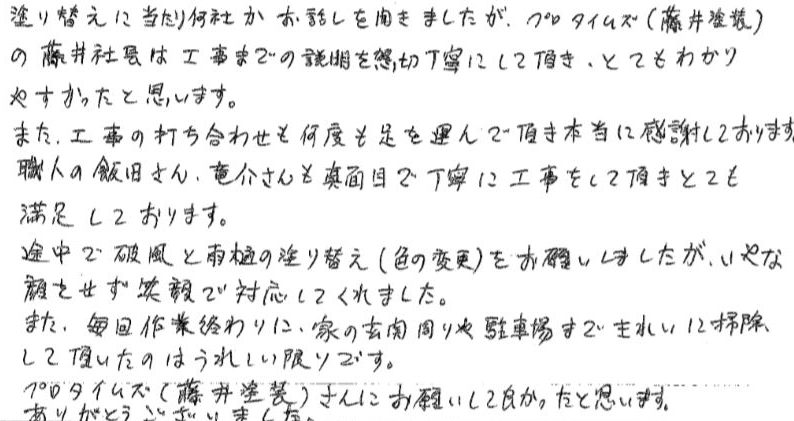 塗り替えに当たり何社かお話を聞きましたが、プロタイムズ(藤井塗装)の藤井社長は工事までの説明を懇切丁寧にして頂き、とてもわかりやすかったと思います。また、工事の打ち合わせも何度も足を運んで頂き本当に感謝しております。職人の飯田さん、竜介さんも真面目で丁寧に工事をして頂きとても満足しております。途中で破風と雨樋の塗り替え(色の変更)をお願いしましたがいやな顔をせず笑顔で対応してくれました。また、毎回作業終わりに家の玄関周りや駐車場まできれいに掃除して頂いたのはうれしい限りです。プロタイムズ(藤井塗装)さんにお願いして良かったと思います。