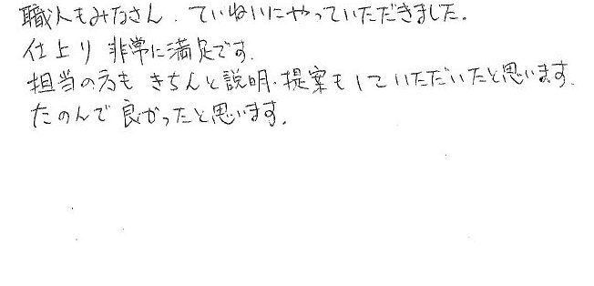 職人もみなさん、ていねいにやっていただきました。仕上がり非常に満足です。担当の方もきちんと説明、提案もしていただいたと思います。たのんで良かったと思います。