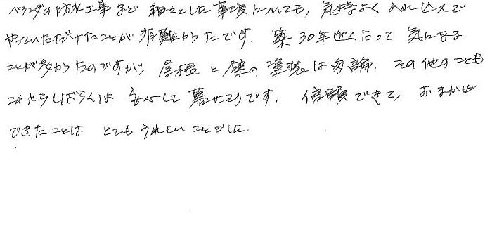築30年近くたって気になることが多かったのですが、屋根と壁の塗装は勿論、その他のこともこれからしばらくは安心して暮らせそうです。信頼できて、おまかせできたことはとてもうれしいことでした。