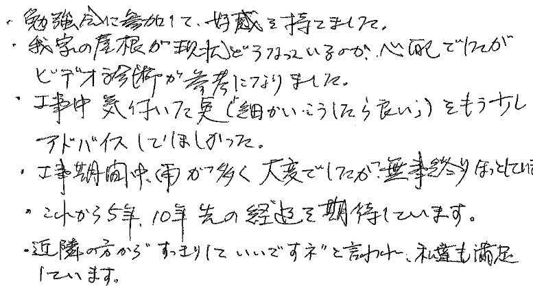 ・工事期間中、雨が多く大変でしたが、無事終わりほっとしています。