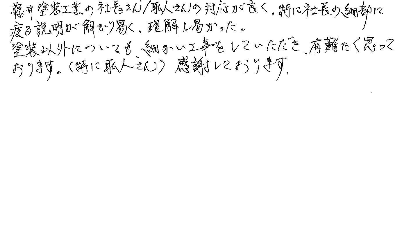 藤井塗装工業の社長さん、職人さんの対応が良く、特に社長の細部に渡る説明が解りやすく、理解し易かった。