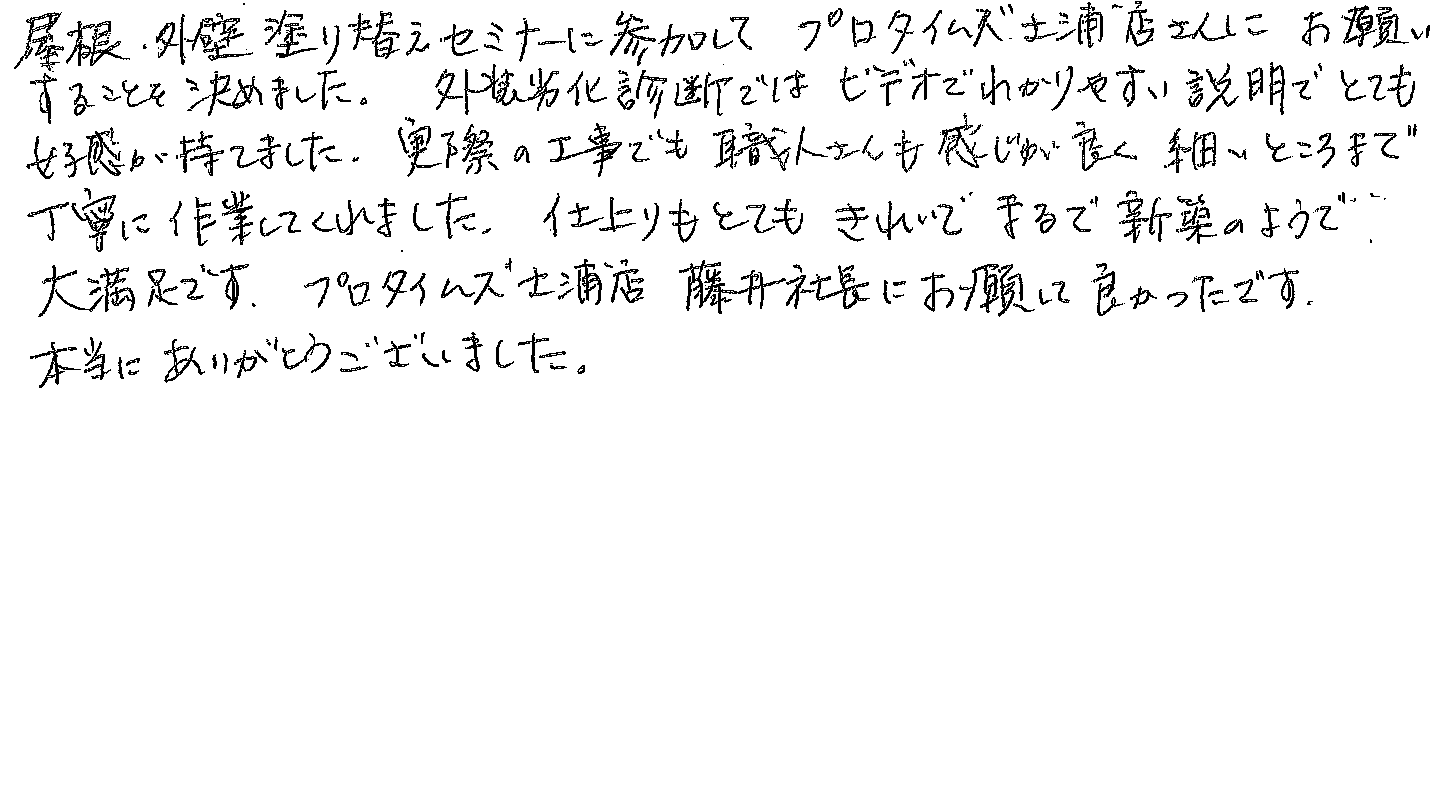 屋根・外壁塗り替えセミナーに参加してプロタイムズ土浦店さんにお願いすることを決めました。外装劣化診断ではビデオでわかりやすい説明でとても好感が持てました