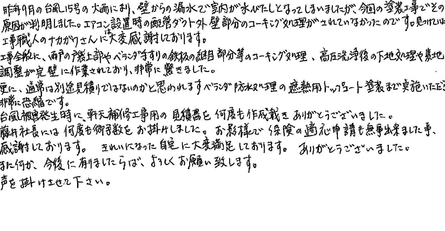 台風被害発生時に、軒天補修工事用の見積書を何度も作成いただきありがとうございました。藤井社長には何度も御手数をお掛けしました。お陰様で保険の適応申請も無事出来ました事、感謝しております。きれいになった自宅に大変満足しております。ありがとうございました。また何か、今後有りましたらば、よろしくお願い致します。声を掛けさせて下さい。