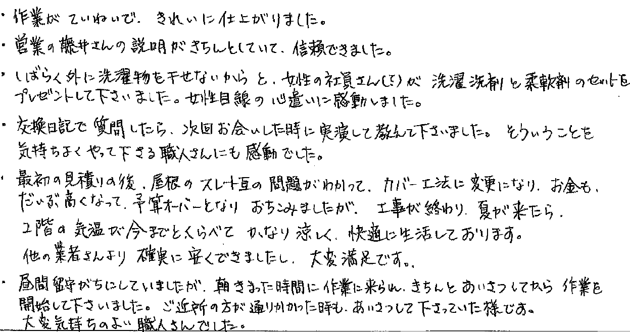 ・最初の見積りの後、屋根のスレート瓦の問題がわかって、カバー工法に変更になり、お金もだいぶ高くなって、予算オーバーとなりおちこみましたが、工事が終わり、夏が来たら、2階の気温が今までとくらべて、かなり涼しく、快適に生活しております。他の業者さんより確実に安くできましたし、大変満足です。
