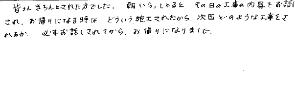 皆さんきちんとされた方でした。朝いらっしゃると、その日の工事の内容をお話し