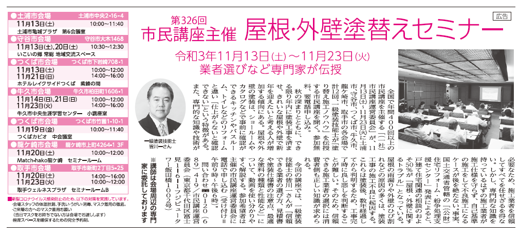 住宅の塗り替えは専門的な知識や技術が必要なため、施工業者を信頼して全てを任せてしまう方も多いのではないかと思います。しかしリフォーム工事全体の約4割以上で塗装工事のトラブルが生じております。そこで未然にトラブルを防ぐため、一般の皆様にも塗装工事の正しい知識を分かりやすく説明します。受講後には個別に質問や相談も承ります。是非この機会にご相談ください。