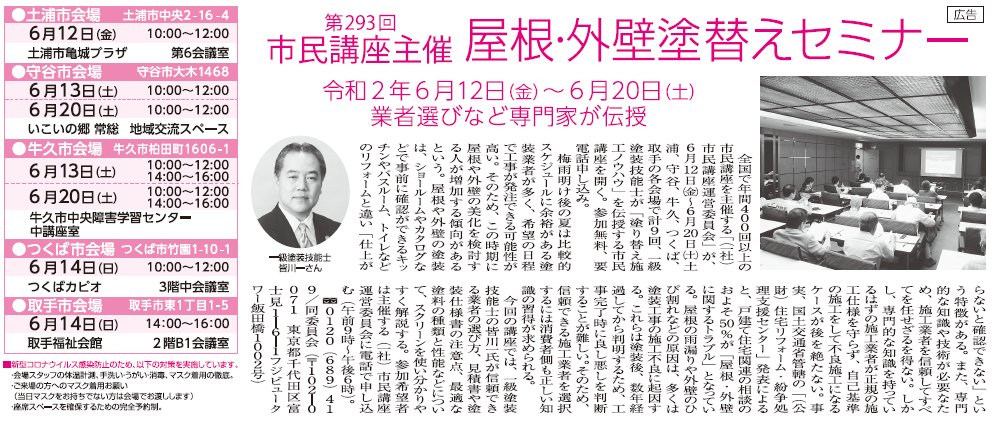 住宅の塗り替えは専門的な知識や技術が必要なため、施工業者を信頼して全てを任せてしまう方も多いのではないかと思います。しかしリフォーム工事全体の約4割以上で塗装工事のトラブルが生じております。そこで未然にトラブルを防ぐため、一般の皆様にも塗装工事の正しい知識を分かりやすく説明します。受講後には個別に質問や相談も承ります。是非この機会にご相談ください。