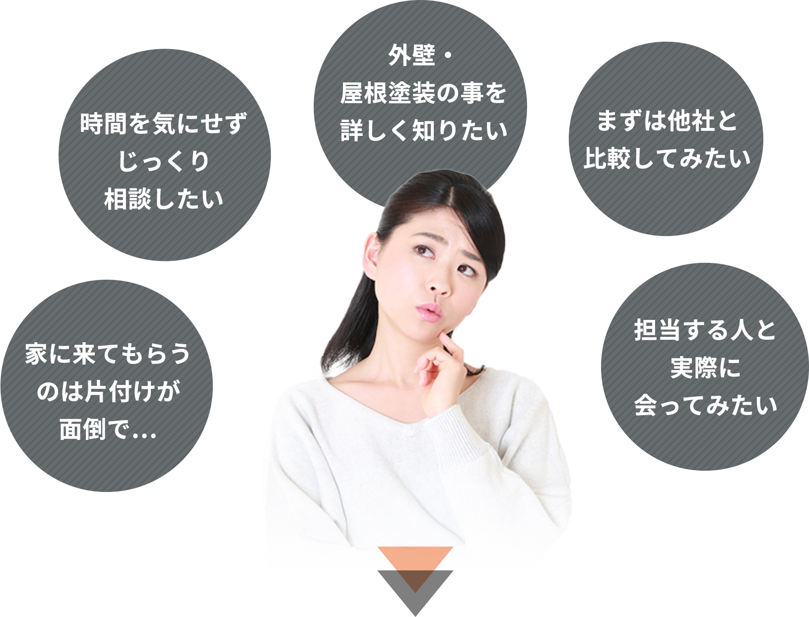 まだ本格的に塗装工事を考えていなけど、相談だけしてみたいという方のご来店もお待ちしております。 スタッフがお客様のお住まいの悩みに合わせてアドバイスを行ないます。